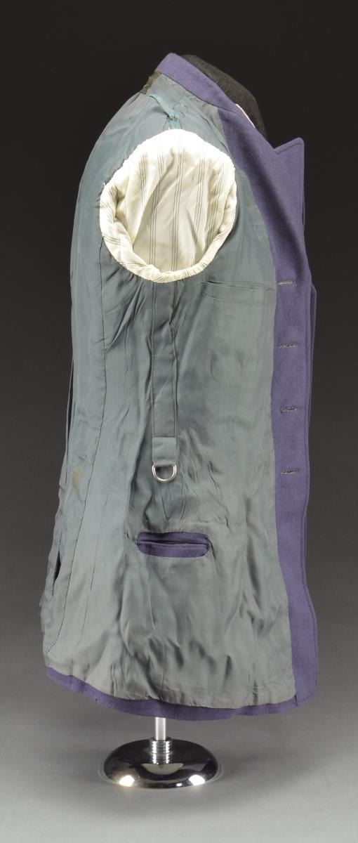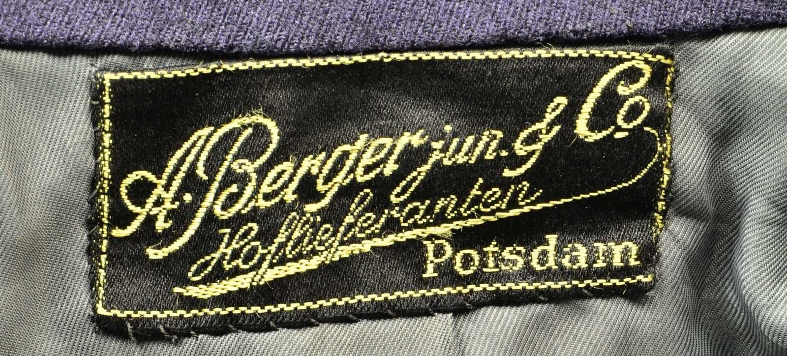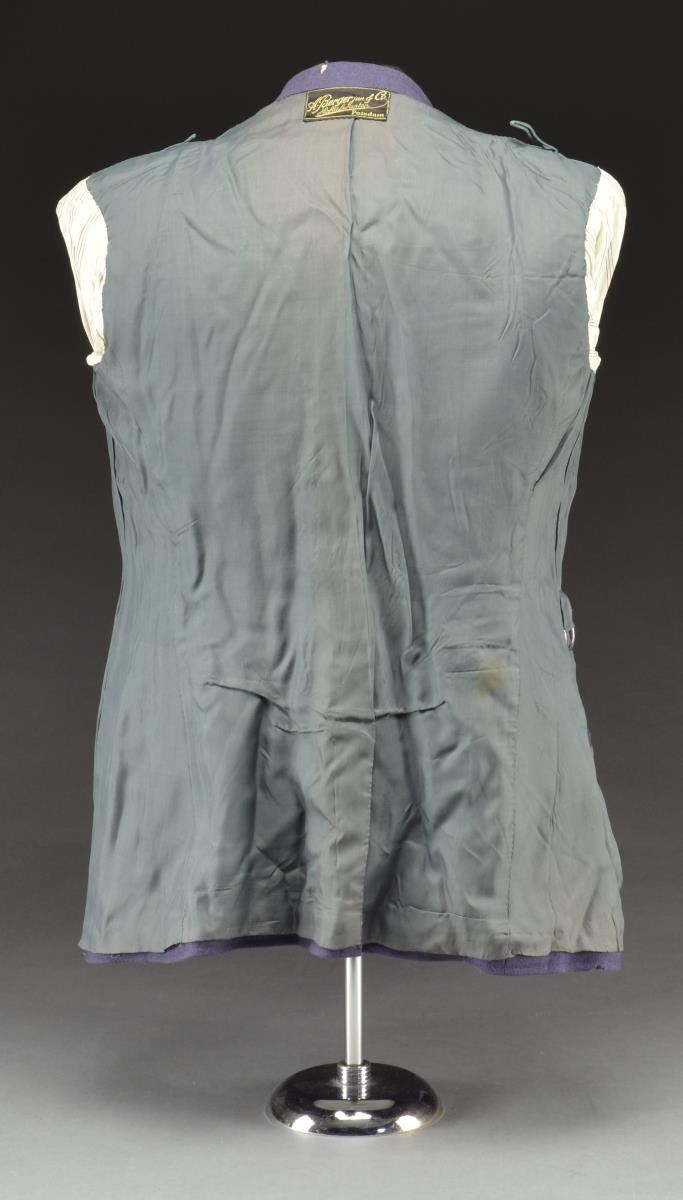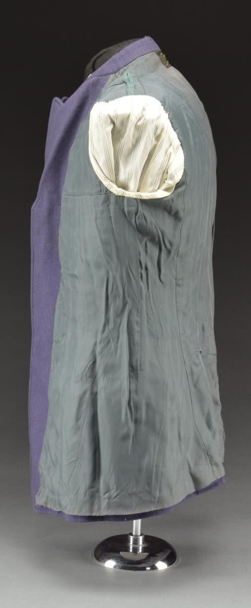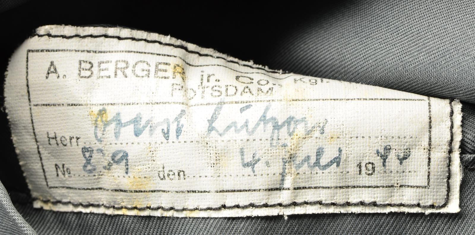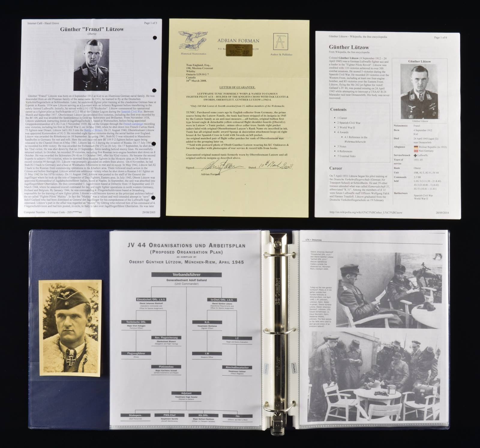 TO GUNTHER LUTZGOW WHO WAS CREDITED WITH 110 VICTORIES IN OVER 300 COMBAT MISSIONS. Uniform coat is of blue gabardine wool with 4 pebble finished aluminum buttons down the front & 1 on each pocket. Above the left breast pocket are 7 loops to support a medal bar & above them are 3 loops to support a clasp. There are a pair of loops on the left pocket & 2 pair below the pocket. The right breast pocket has a single pair of loops. Shoulder boards are woven silver bullion with 2 gold pips each & are backed in yellow denoting a Colonel attached to a flight unit. The yellow wool collar tabs are piped in silver bullion & each bear a 3 gull & wreath insignia. There is a high relief silver bullion Luftwaffe eagle over the right pocket. The uniform lining is gray rayon & the sleeve lining is a striped white rayon. There is an interior D ring & slit for suspension of a sword/dagger. The label below the collar reads, “A. Berger jun. & Co. Hoflieferanten Potsdam”. The interior of the left inside pocket has a tag that reads, “A. BERGER jr. Co., Kgl. Hoflief. POTSDAM Herr [Oberst Lutzow](written in ink) No. [839](written in ink) den [4. Juli](written in ink) 19[44](written in ink)”. A black leather officer’s belt with a 2 tongue, pebble finished frame buckle accompanies the uniform. Also included is a period postcard of Colonel Lutzow wearing a fleece lined flight jacket, side cap & his Knight’s Cross with swords & oak leaves. Colonel Gunther Lutzow was one of the best known & most successful aces of WWII. He is credited with 110 victories in more than 300 combat missions. His flight service started in the Spanish Civil War with 5 confirmed kills. He went on to score 20 victories over the Western Front & 85 victories over the Eastern Front. He became Group Commander of JG3 late in 1939 & held various positions in the Luftwaffe despite his difficult reputation. He refused to comply with SS orders to supply men for execution squads thus earning the ire of the SS as well as the NSDAP. He recorded 2 victories while flying the new ME262 jet fighter but was missing in action & presumed killed a few days later on April 24, 1945. UNATTACHED ACCESSORIES: copies of information pertaining to Captain Gunter Lutzow & his service with the Luftwaffe. CONDITION: uniform shows light wear overall with a few sm. moth nips to the underside of the shoulder boards. There is a sm. hole on the inside rear of the collar. Leather belt shows light to moderate wear. Postcard is a bit toned. PROVENANCE: Lifetime Collection of Dennis Ottaway. (02-15995-1/BF). $4,000-5,000.