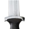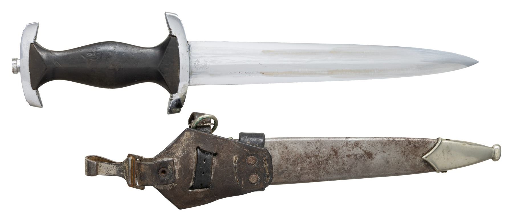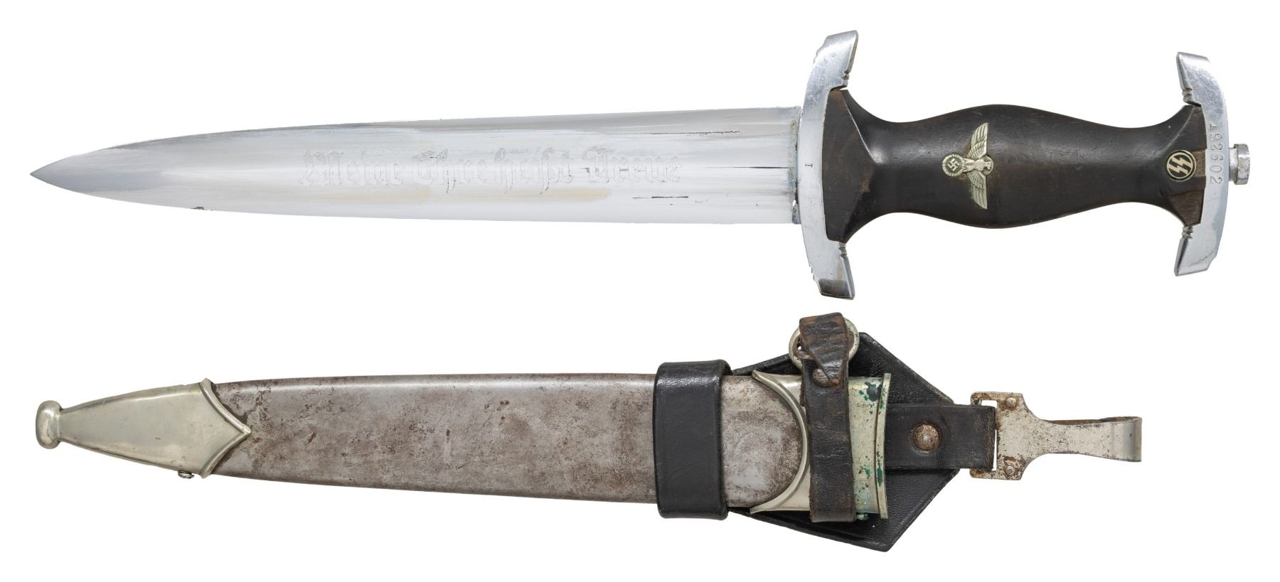 A good honest example of a WWII German M1933 SS dagger measuring 14 3/4" overall, The blade is engraved " Meine Ehre Heisst Treue ", and the reverse is marked "BOKER . SOLINGEN .". The plated crossguard is stamped "I" on the front, and the top guard is stamped "192602". Black wooden grip with inset eagle and black enameled SS button. Black anodized scabbard with plated mounts. Black leather dagger hanger. CONDITION: blade shows scabbard wear and may have been buffed. Grip shows light wear but has a small chip above the SS button. Scabbard finish is mostly worn away. There is 1 screw missing from the tip and 1 screw missing from the throat. Hanger shows overall moderate wear. (02-24152/BF). NON-GUN. $1,200-1,600.