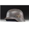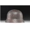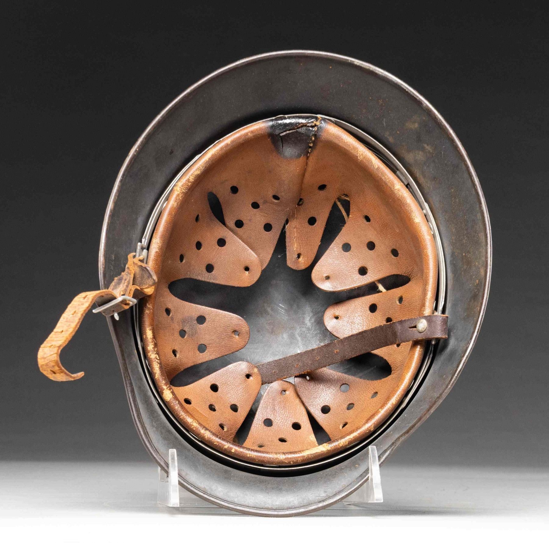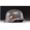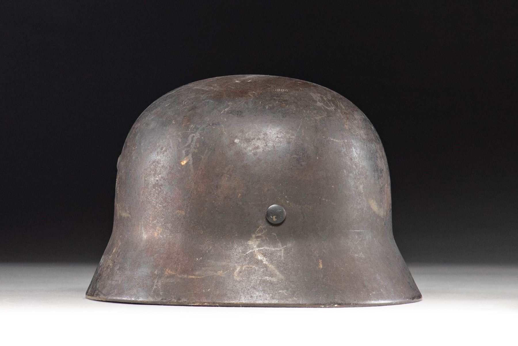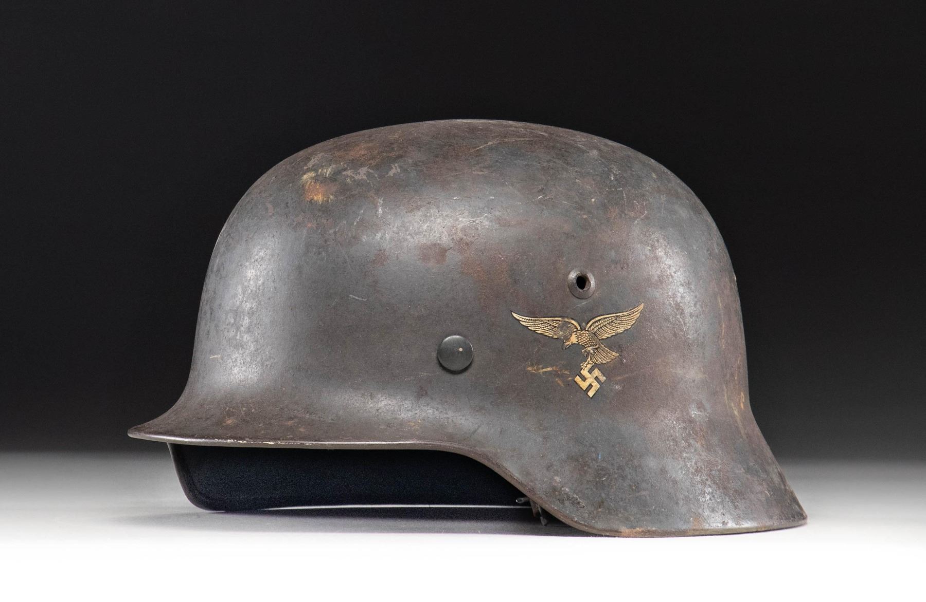 Fine WWII German M1935 double decal Luftwaffe helmet in dark gray paint with a Luftwaffe decal on the left and and a National colors decal on the right. The interior rear is stamped " 4198 " and the interior left is stamped " ET66 " indicating manufacture by Eisenhuttenwerke of Thale. Brown 9-tongue liner with leather chinstrap. CONDITION: helmet retains 90%+ finish. The Luftwaffe decal is 85% and the National decal is 80%. Liner is solid and the chinstrap is complete but broken. (02-25296/BF). NON-GUN. $500-800.