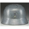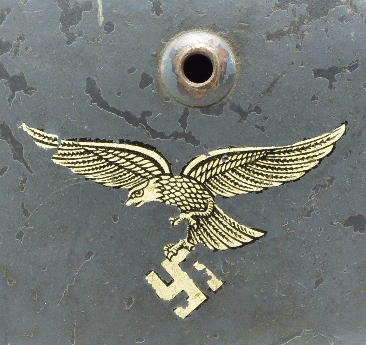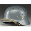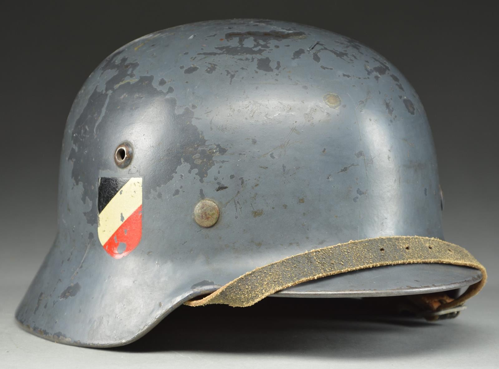 This helmet has a deep steel blue repainted finish likely done at the factory. The left side shows an early “snake leg” Luftwaffe decal and the right side shows the National Color decal. The interior rear is stamped “2341” and the interior left side is stamped “ET64”. Black leather chinstrap with brown leather 8-tongue size 57 liner. There is a faint impressed maker’s mark at the rear of the liner. The liner also has a set of initials and a partially obscured name due to white mold. There also appears to be an ink stamp in the crown of the helmet. CONDITION: repainted finish is approx. 85% with the balance being original finish. Luftwaffe decal is 95%. National decal is about 92%. Chinstrap & liner both show light to moderate wear. PROVENANCE: From the Lifelong Collection of Glen E. Mattox. (02-18928/BF). $700-1,000.