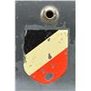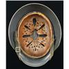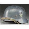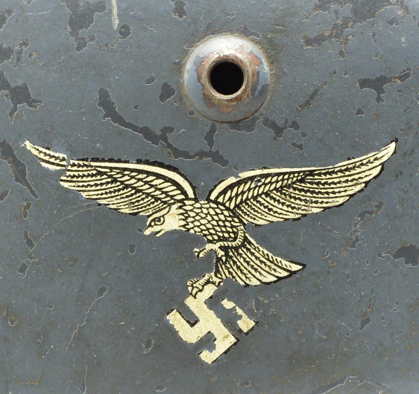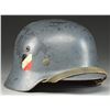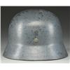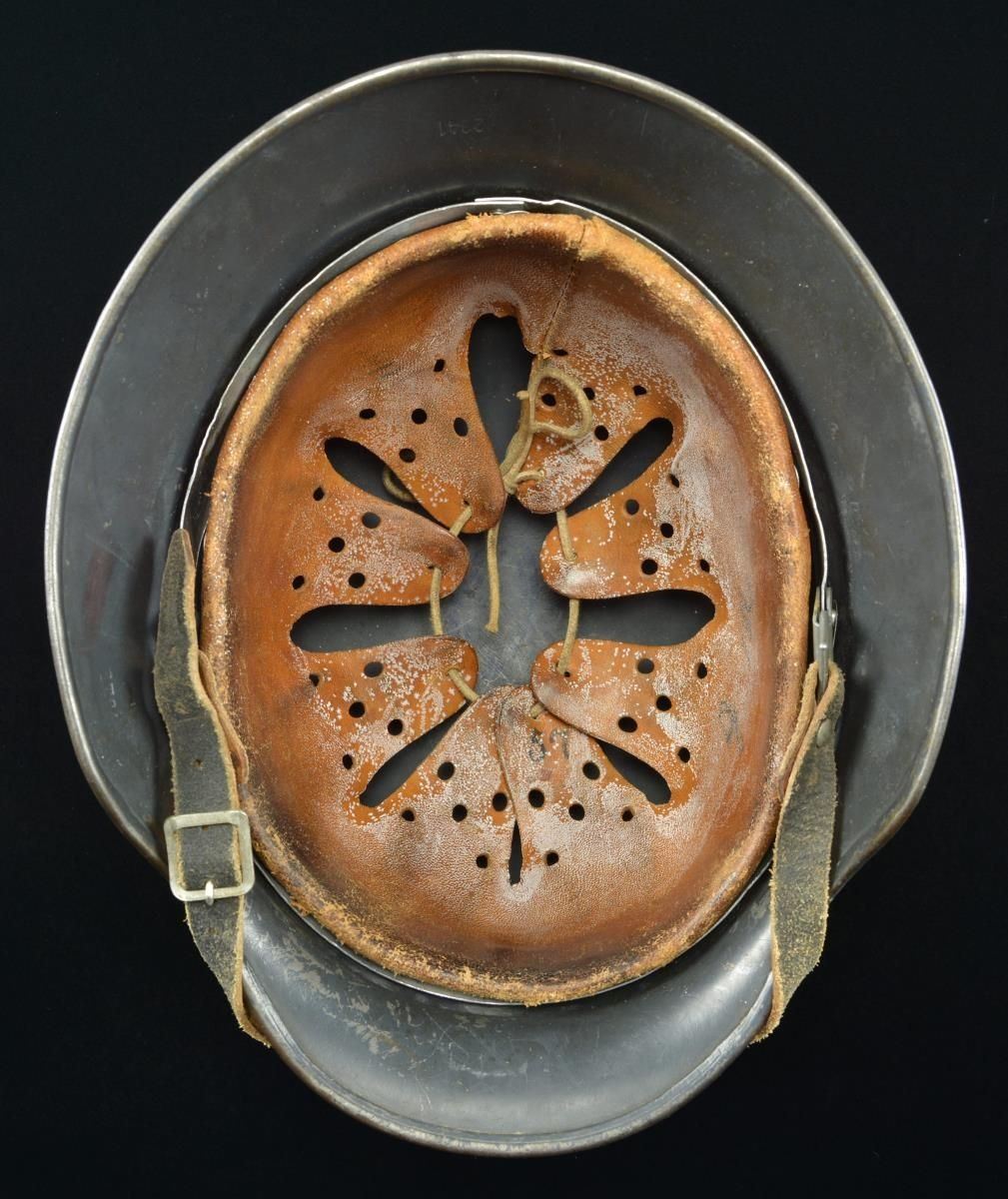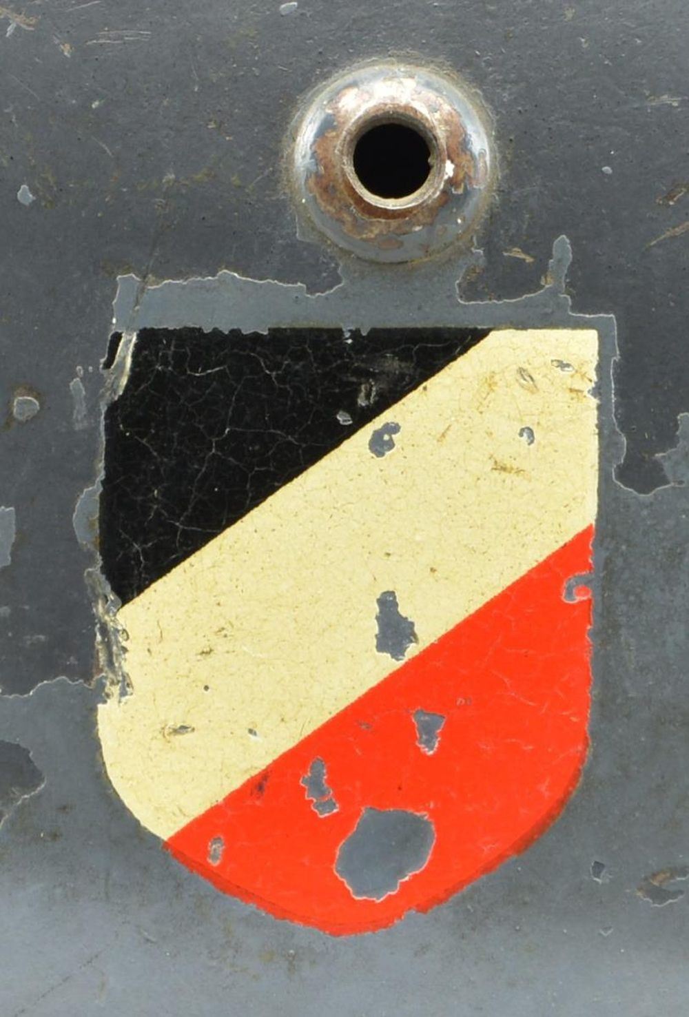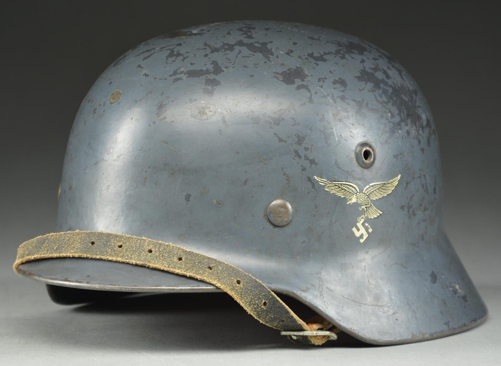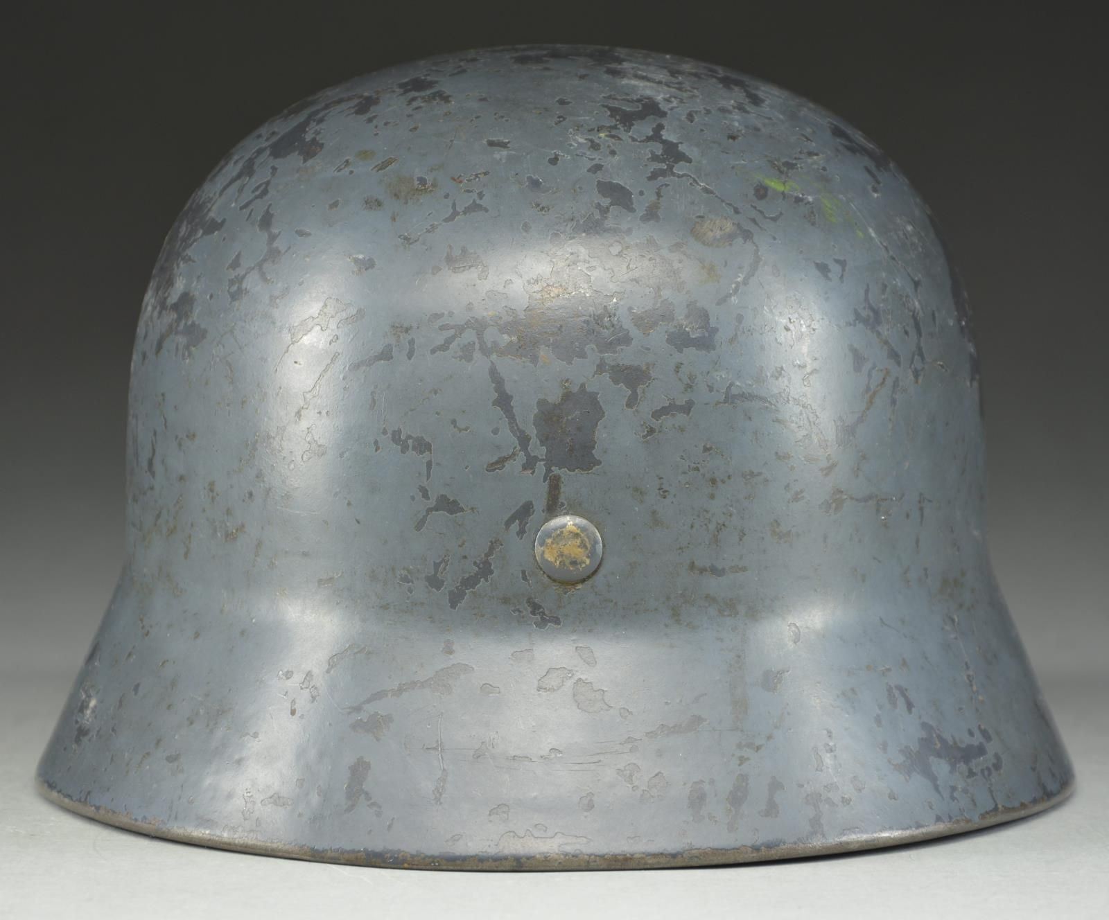 This helmet has a deep steel blue repainted finish likely done at the factory. The left side shows an early "snake leg" Luftwaffe decal and the right side shows the National Color decal. The interior rear is stamped "2341" and the interior left side is stamped "ET64". Black leather chinstrap with brown leather 8-tongue size 57 liner. There is a faint impressed maker’s mark at the rear of the liner. The liner also has a set of initials and a partially obscured name due to white mold. There also appears to be an ink stamp in the crown of the helmet. CONDITION: repainted finish is approx. 85% with the balance being original finish. Luftwaffe decal is 95%. National decal is about 92%. Chinstrap & liner both show light to moderate wear. PROVENANCE: From the Lifelong Collection of Glen E. Mattox. (02-18928/BF). $700-1,000.