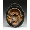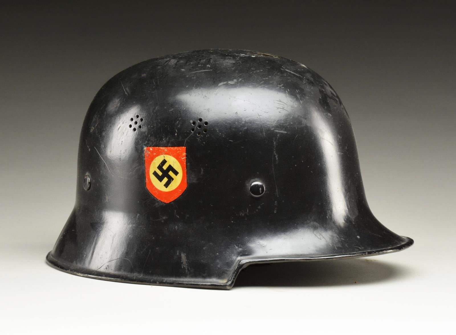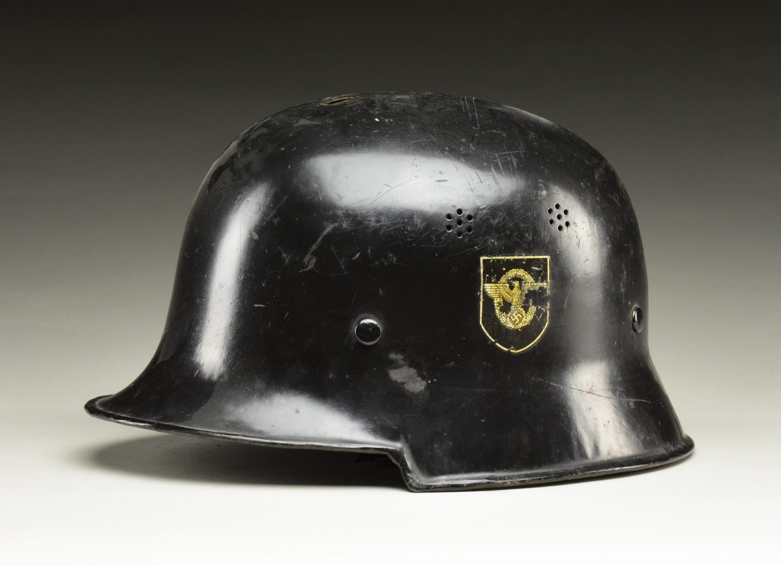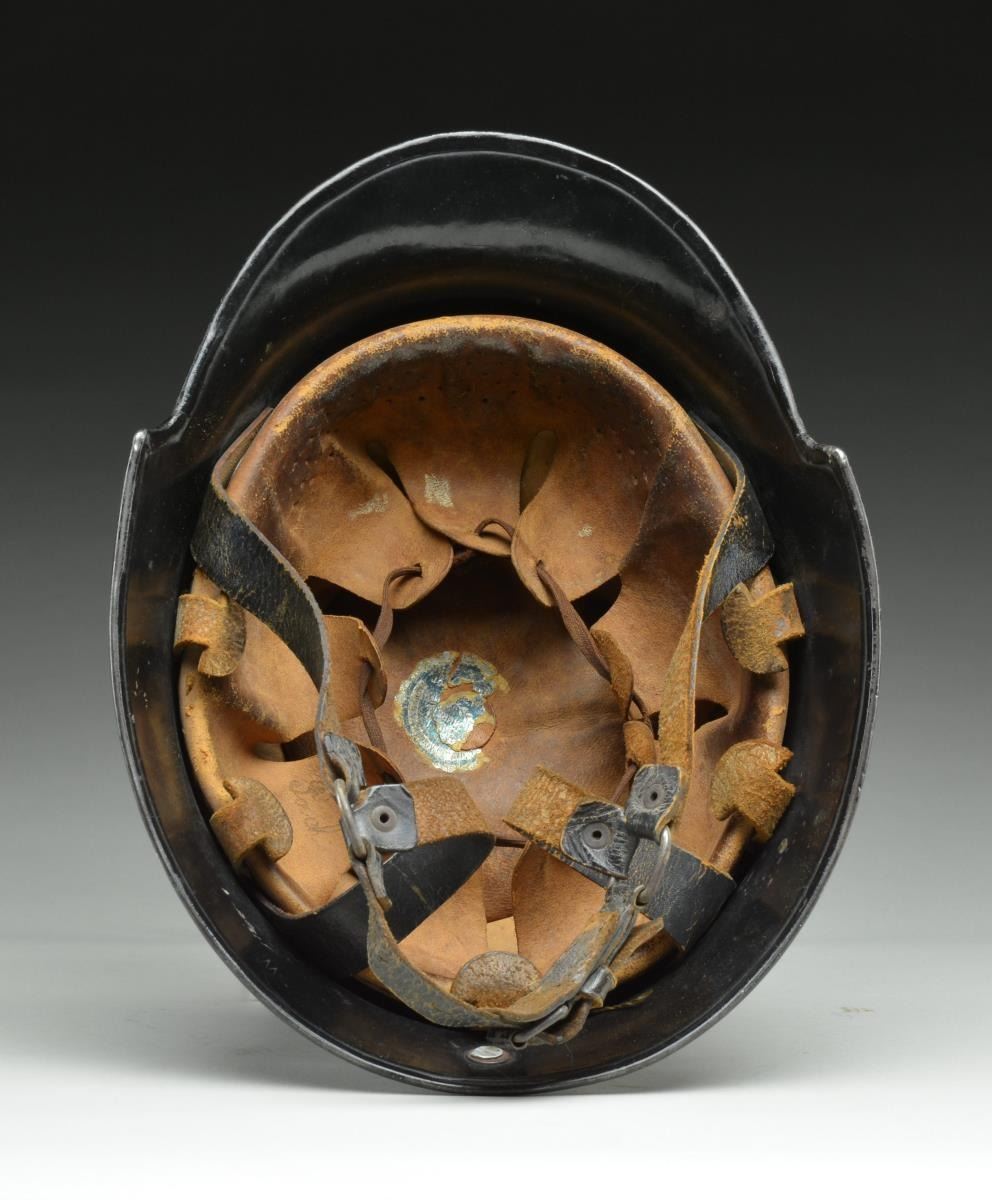 Helmet is black painted w/ police decal on right & Party decal on the left. Flared edge. Liner & chinstrap are present. Interior crown pad intact. CONDITION: good to very good overall appearance retaining much of painted black finish & decals w/ a partially legible label inside crown. Liner & straps are intact w/ wear & flexing. Aluminum comb missing. (02-16195/MD/BF). $200-300