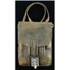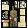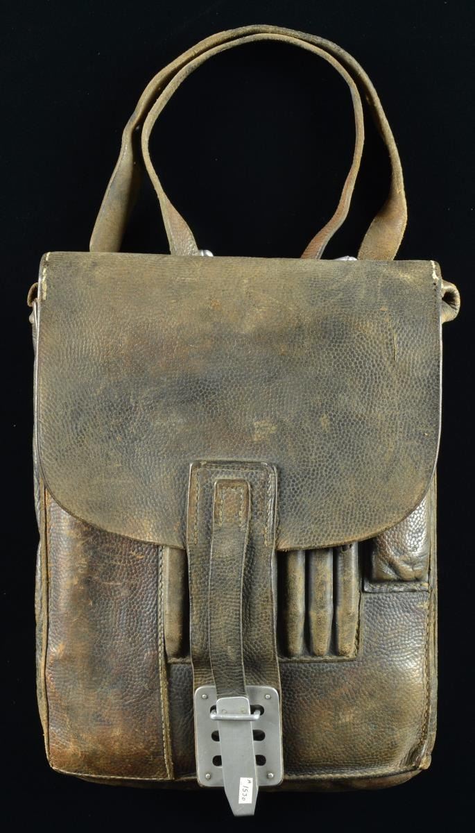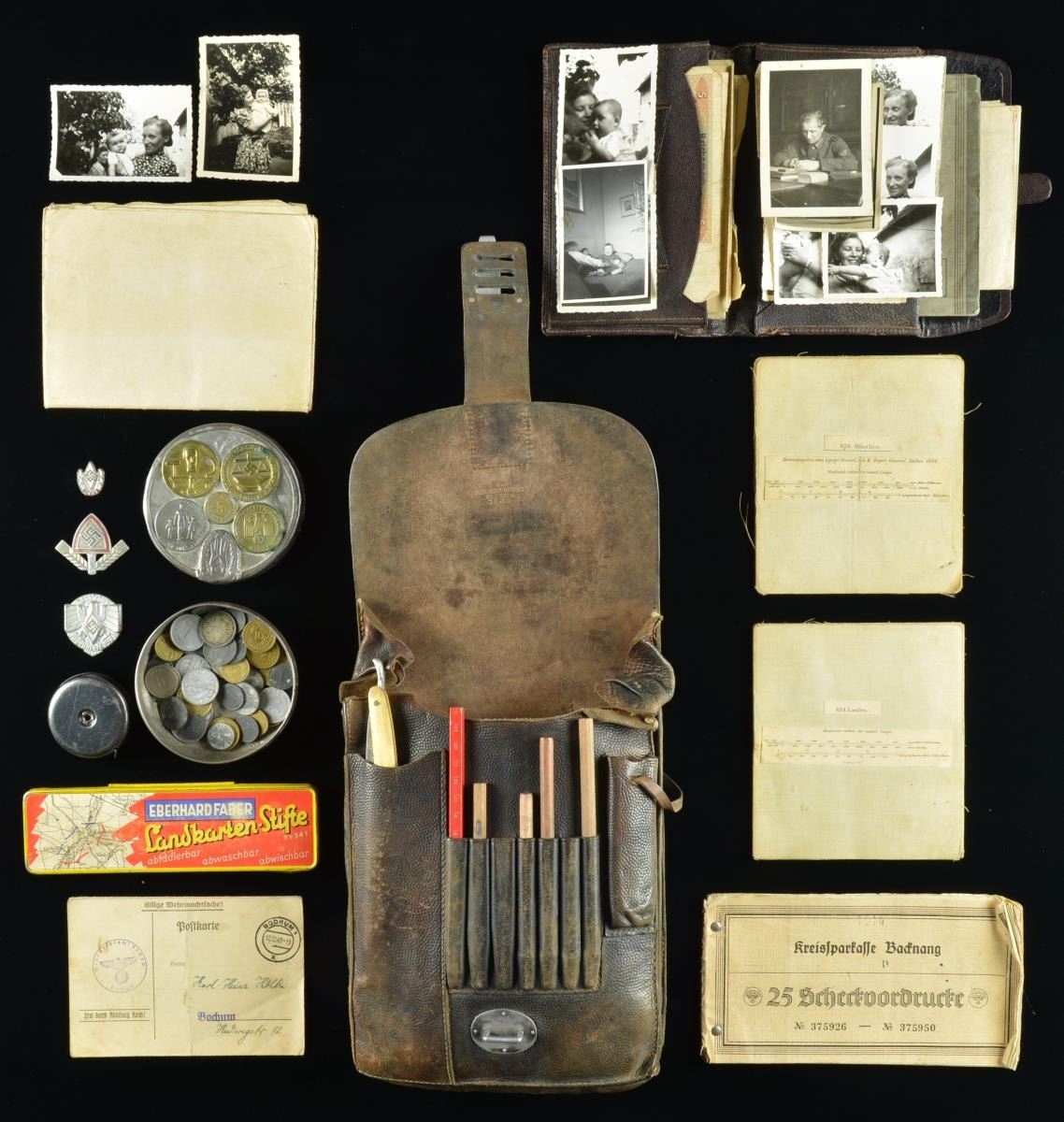 A very interesting map case which remains in “as brought back” condition and completeness. The pebble finished leather map case contains 5 pencils of varying lengths & styles. A small tin containing approximately 51 WWII era coins apparently collected around Europe by the soldier. The tin also contains 3 WWII German tinnies with pins removed. The lid of the case has a coin and 5 tinnies soldered to it. The case further contains a tape measure, whistle, leather wallet, wehrpass, several maps, several photographs, a District Savings Bank book, a transportation pass, a tin pencil box with colored pencils, and 2 bank notes. CONDITION: leather shows wear but remains supple. Included items show varying degrees of wear. Most coins show average circulation. Zinc coins show oxidation. (02-17952/BF). $400-700.