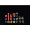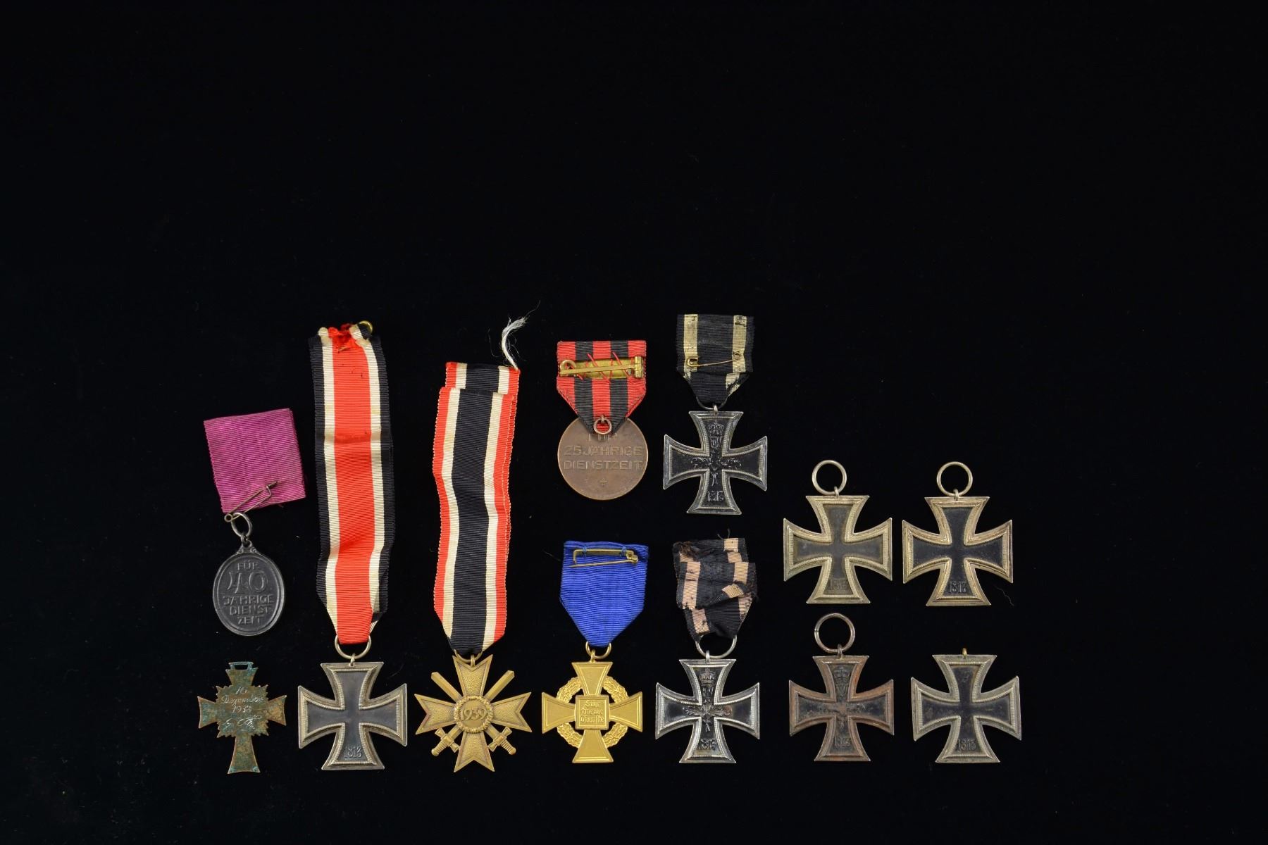 This lot consists of 3 WWII 2nd Class Iron Crosses with no ribbon. / 1 WWII 2nd Class Iron Cross with ribbon. / 2 WWI 2nd Class Iron Crosses with ribbon. / 1 WWI 2nd Class Iron Cross without ribbon. / 1 Faithful Service Medal in gold for 40 years of service. / 1 Bronze Mothers Cross with no ribbon. / 1 WWI 1914-18 Cross with swords and no ribbon. / 1 WWII War Service Cross with swords and ribbon. / 1 Fire Department 40-Year Service Medal with ribbon. / 1 Fire Department 25-Year Service Medal with ribbon. / 1 Infantry Assault Badge with a narrow pin and unmarked back. / 1 Luftwaffe Flak Badge with a narrow pin and unmarked reverse. / 1 DRL Sports Badge with a wide pin and marked reverse. / 1 General Assault Badge with a narrow pin, marked "f.o." on the reverse. / 1 WWI Black Wound Badge. / 2 WWII Black Wound Badges. / 1 WWII Silver Wound Badge with a broken catch. / 1 German Italian 1940 desk medal in brass. / 1 Cap wreath cockade. / 1 Well-worn Baden Napoleonic Wars Service Medal with a black ribbon. CONDITION: all items generally show light wear, unless otherwise noted. (02-22922-3/BF). $800-1,100.