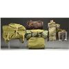 This lot includes 1 dull olive drag backpack with black leather attachment straps & metal clips on the bottom. The straps are pulled & buckled over a camouflage shelter half. / 1 Olive drab backpack with black leather straps & a Pony fur outer flap. / 1 Olive drag backpack with black leather straps & a bi-color Pony fur outer flap. / 1 Large dull olive drab canvas pack with khaki cotton straps & khaki cotton edging to all flaps. Pack cinches with a rope at the top & has a large D ring buckle in the center rear. / 1 Olive drab backpack with black leather attachment straps & Pony fur outer flap. This pack has permanently attached over the shoulder straps. / 1 Olive drab backpack with brown leather straps with metal clips on the top & bottom. / 1 Camouflage shelter half. / 5 Olive drab bread bags with black leather straps, 1 with shoulder sling inside. / 1 Harness sling for carrying equipment over the shoulder. / 1 Small pack device that encompasses a mess kit, shelter half with poles, a bread bag & a boot knife. CONDITION: all items generally show light wear. All straps, clips & buckles appear present. Some items include carrying straps. (02-16403/BF). $1,000-1,600.