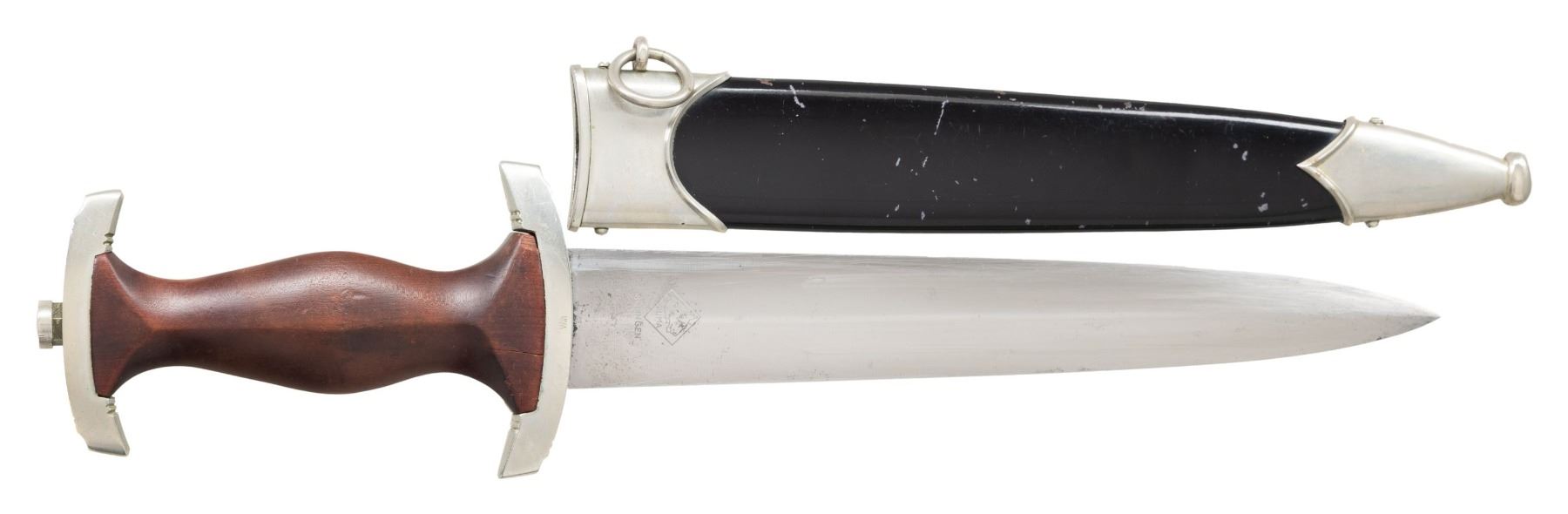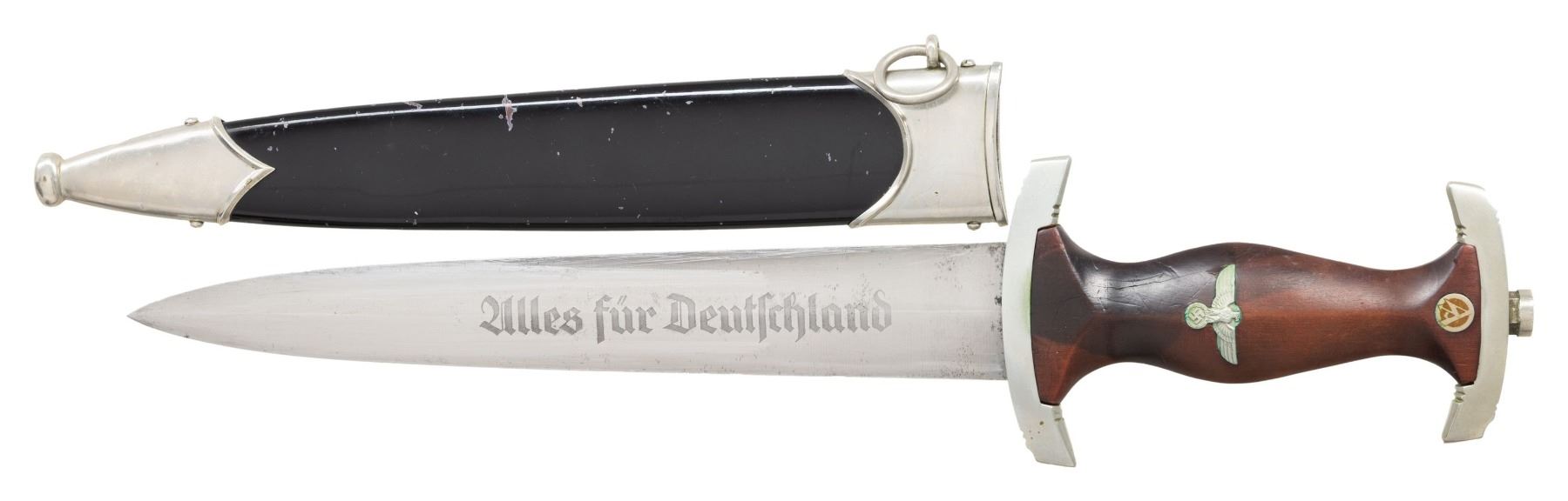A nice example of a WWII German NSKK or motor corps dagger. This dagger measures 14 3/4" overall with a 8 3/4" blade that is etched "Alles fur Deutchland". The opposite side of the blade is marked " (logo) PUMA SOLINGEN". The nickel silver crossguard is stamped on the reverse " Wm " for the Westmark district near Germany's western border. Matching nickel silver pommel guard with brown wooden handle featuring an inset eagle and brown enameled SA button. Black enameled nickel silver mounted scabbard. CONDITION: light wear overall. Blade shows substantial original factory polish. Scabbard finish is 98%+. (02-24995/BF). NON-GUN. $500-700.
