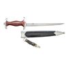 Overall length: 14 7/8". Blade is etched "Alles fur Deutschland" & is marked on the opposite side "RZM M 7/73". Plated crossguard & pommel. Brown wood grip with inset eagle & brown enamel SA button. Sheath has a black enameled finish with plated throat & tip. Correct black leather hanger with clip marked on the reverse "RZM M5c/93". CONDITION: blade shows primarily only sheath wear. Hilt shows light wear overall as does the sheath. Hanger shows light wear. (02-17745/BF). $500-700.