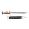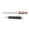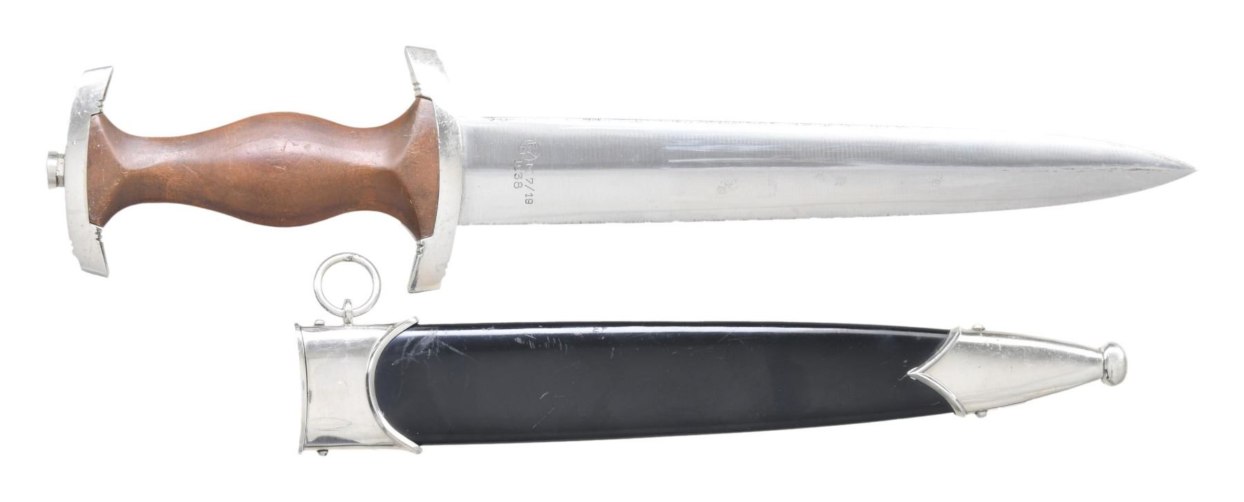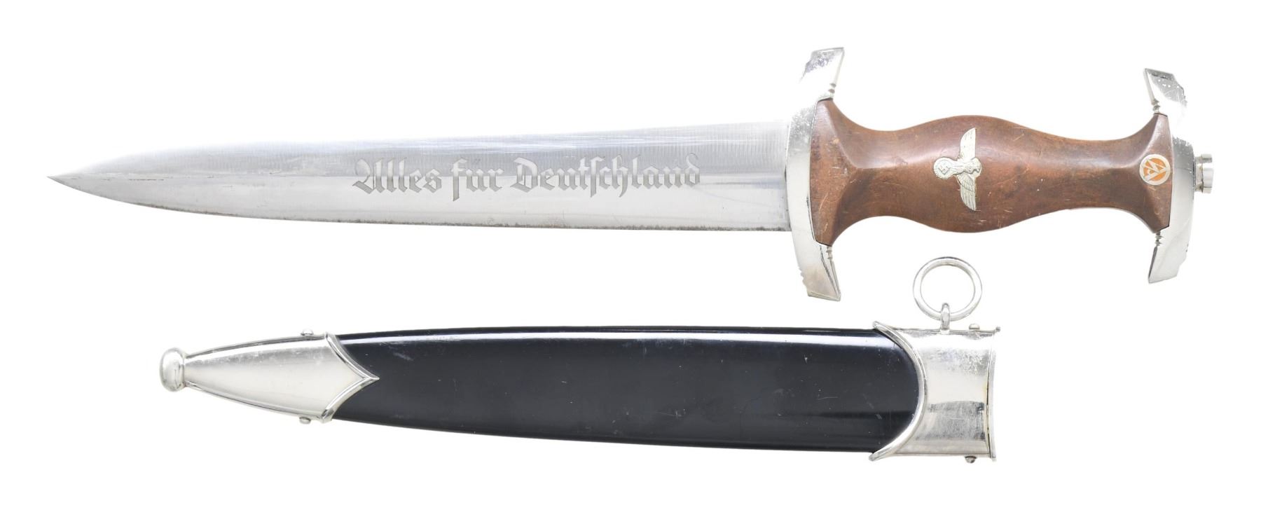 A very nice example of a WWII German NSKK dagger measuring 15 7/8" overall. The blade is etched "Alles fur Deutschland" on the front and is marked on the back "RZM M7/18 1938". Plated crossguard and pommel guard with a wooden grip having an inset eagle and enamel SA button. Black painted scabbard with plated mounts. CONDITION: dagger shows light wear overall and the blade shows only slight scabbard wear. (02-24499-2/BF). $500-750.