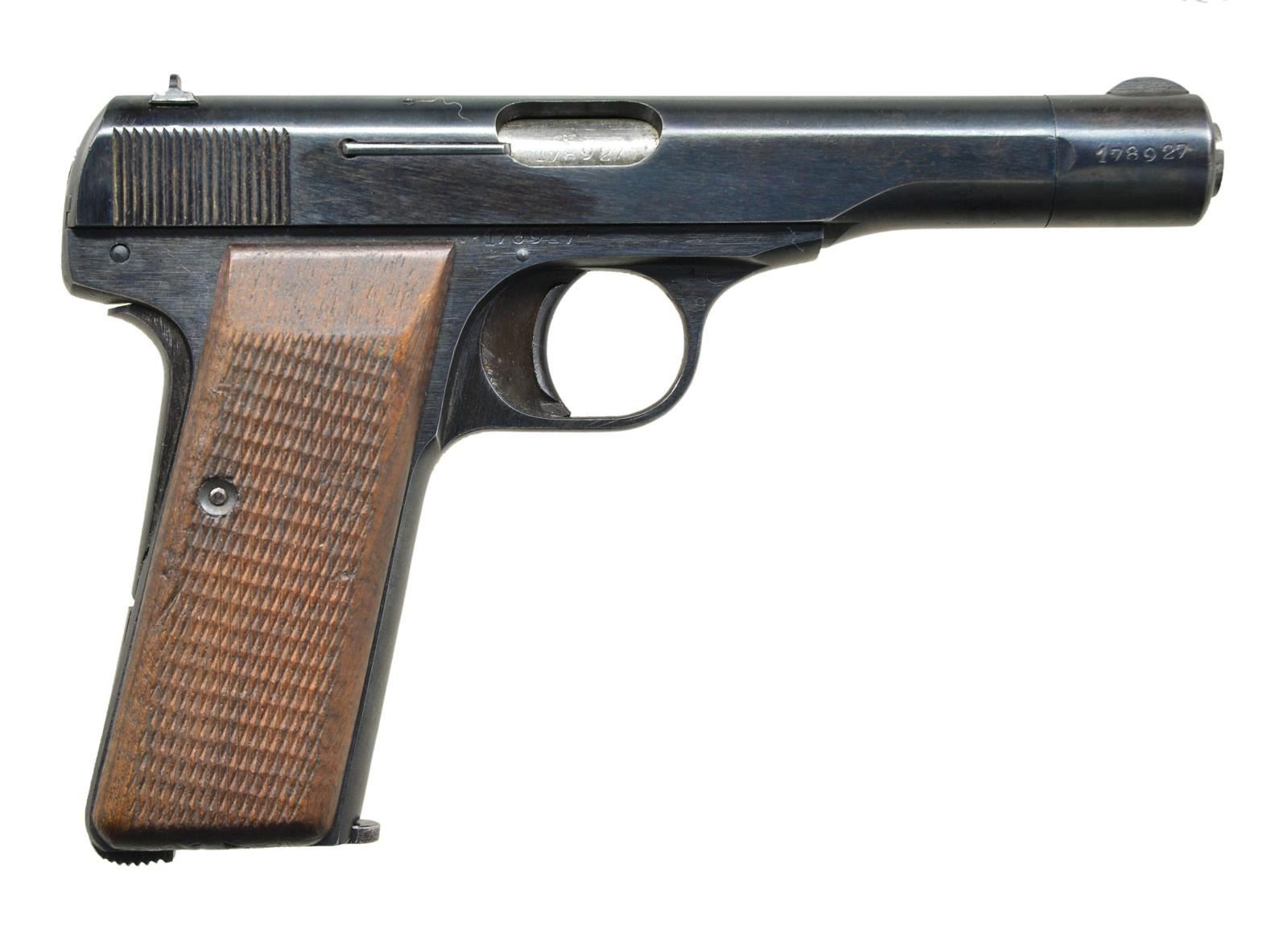 PISTOL. Cal. 32 ACP (7.65mm). S# 178927. Mfg. 1942 - May 1943 (S# range 57000 - 220000). Scattered eagle "WaA140" & acceptance proofs plus "(H)" on left side of slide near muzzle. Matching numbered 4 1/2" bbl., slide, frame & bbl. lug. Blue finished pistol w/ flanged trigger, mag. safety & 2 piece checkered wood grips. MAGS: 1 - 9 rd. marked "-FN- / 7.65m/m". CONDITION: very good overall w/ pinprick oxidation throughout. Very good grips. Near excellent bore. (22-5767/MD). CURIO. $500-1,000
