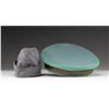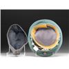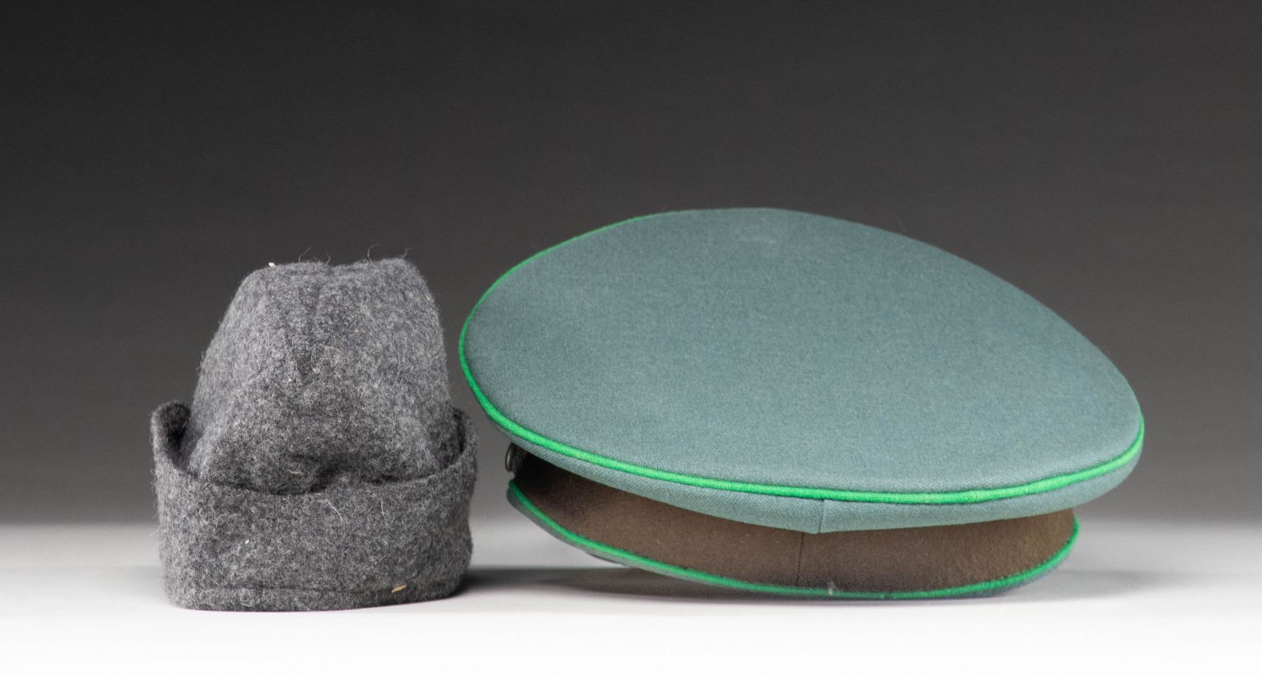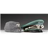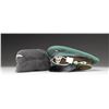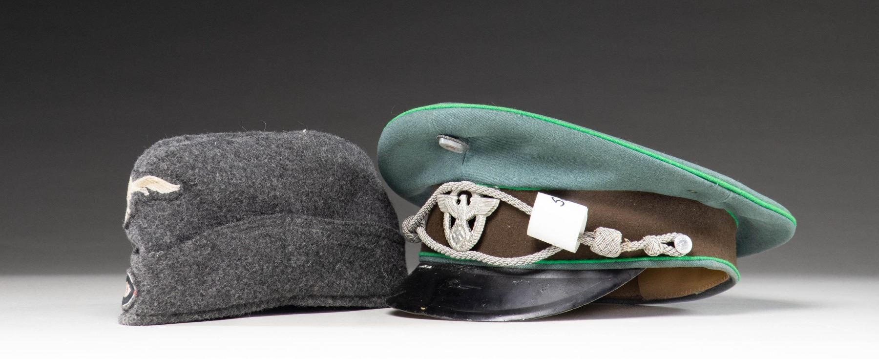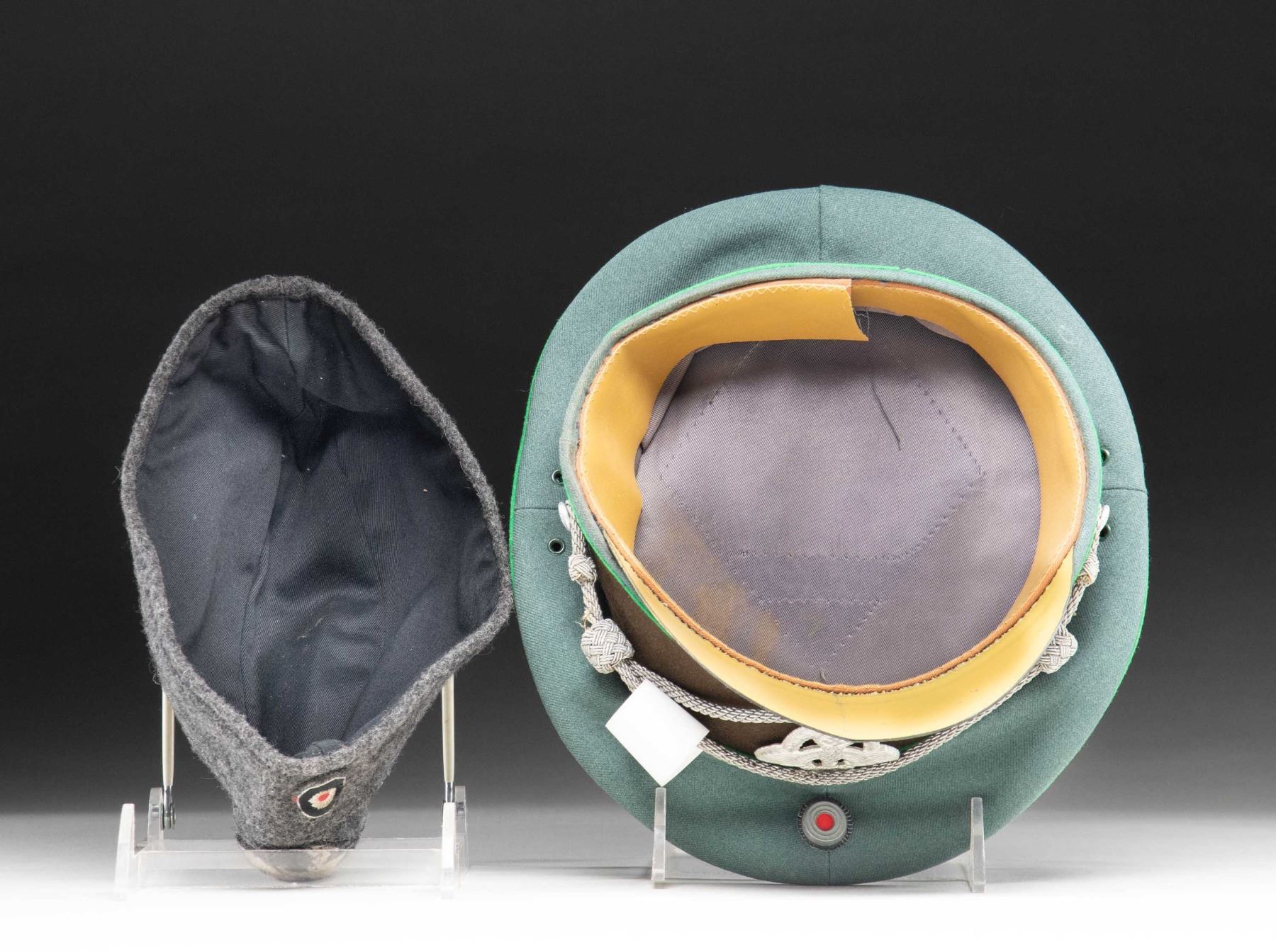 1) WWII German Police official's visor cap. Deep sage green crown with a brown band and bright green piping. The front of the crown has a national cockade and the front of the band has an aluminum police eagle in wreath. Bullion chinstrap and black visor with a tan underside. Tan sweatband with gray lining and a missing sweatshield. CONDITION: the hat body is quite sound but the visor show a bit of degradation. Interior shows light wear. 2) Wool Luftwaffe side cap in gray with a cloth eagle and cockade at the front. Black lining with no markings. CONDITION: light wear. (02-25335/BF). $450-650.