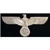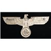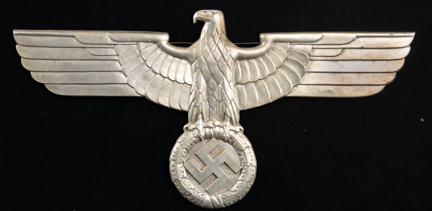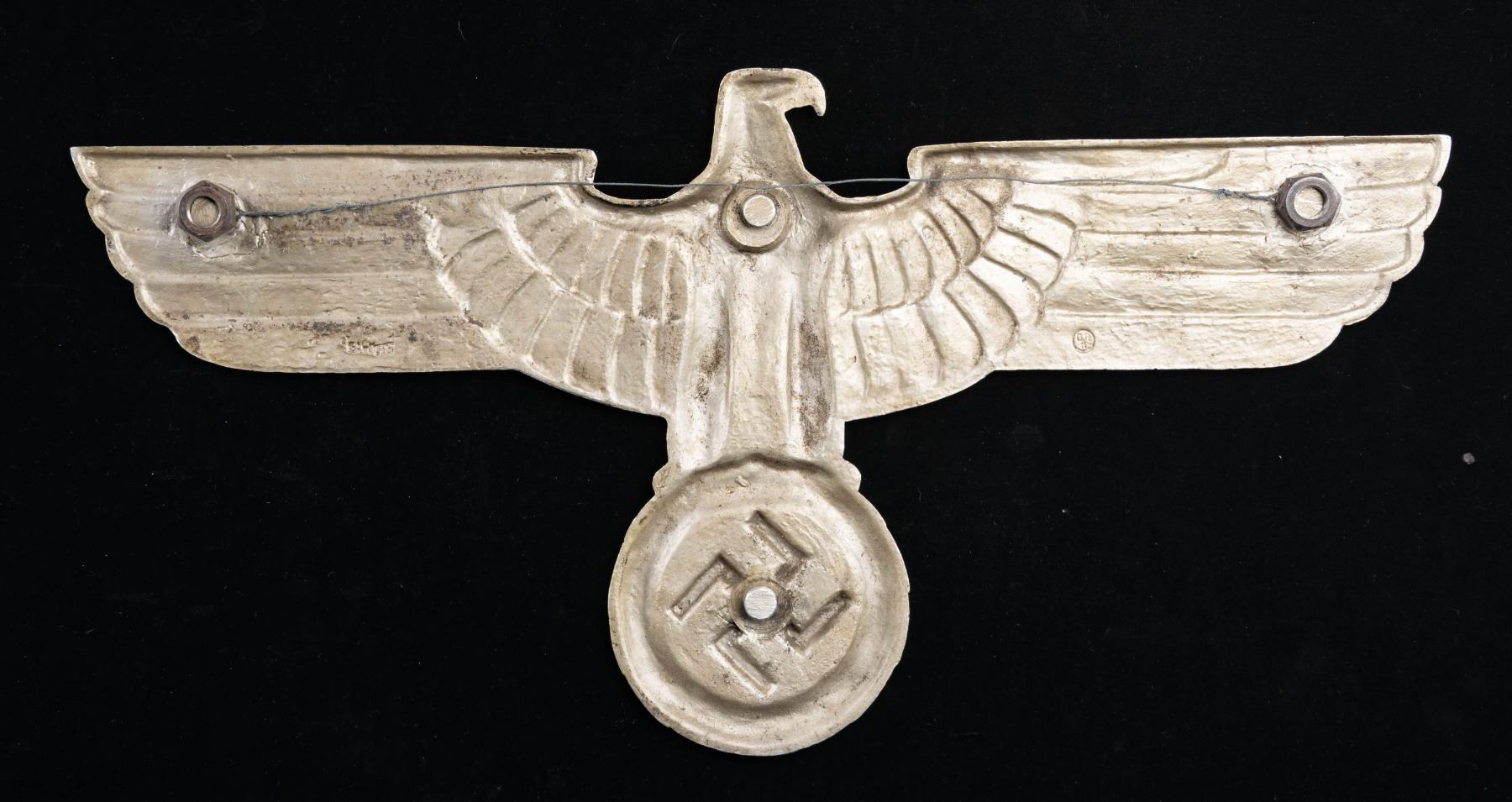A fine example of a WWII German box car eagle used by the Reichbahn. The eagle measures 27" x 14" and features an eagle perched on a wreath that surrounds a Party symbol. The reverse is marked " GAL Mg Si " with initials in a circle that appear to be " GRH ". There are 4 threaded stud on the reverse, 2of which have hex nuts attached. CONDITION: light ear overall with no losses. (02-26175/BF). NON-GUN. $1,200-1,800.
