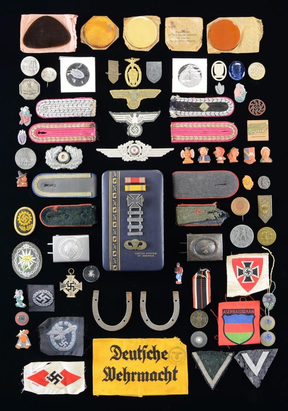 BUCKLES, & A FEW U.S. ITEMS. This lot includes 6 single shoulder straps of various organizations. The smaller straps have severe moth damage. / 1 Pair of police shoulder straps in pink & silver. / 1 Aluminum Luftwaffe visor cap wreath with no pins. / 1 Army cap wreath & cockade with one pin. / 1 Faithful Service Medal 25-Year with no ribbon. / 1 War Merit Medal with ribbon. / 1 Aluminum HJ belt buckle. / 1 Steel Luftwaffe belt buckle. / 15 Tinnies of various materials for assorted organizations. / 26 WHW donation pins of various materials including glass, plastic, terracotta, & metal. / Several replacement lenses for goggles. / 1 Yellow Deutche Wehrmacht armband. / 1 HJ sleeve diamond. / 1 Army breast eagle. / 1 Afrika Corps breast eagle. / 1 Kyffhauserbund sleeve shield. / 2 Luftwaffe sleeve chevrons. / 1 Edelweiss patch. / 1 Black party symbol in wreath patch. / 2 Uncut “ASERBAIDSCHAN” Foreign Fighter patches. / 1 Bevo weave cloth Pilot’s Badge. / 2 U-shaped heel plates. / 1 Box for a US Bronze Star. / 1 Army Qualification Badge. / 1 US Parachute Badge. / 2 Medal ribbon bars. CONDITION: all items show light to moderate wear, except as noted. A couple of the cloth insignia may be of post-war manufacture. (02-21288/BF). $500-700.