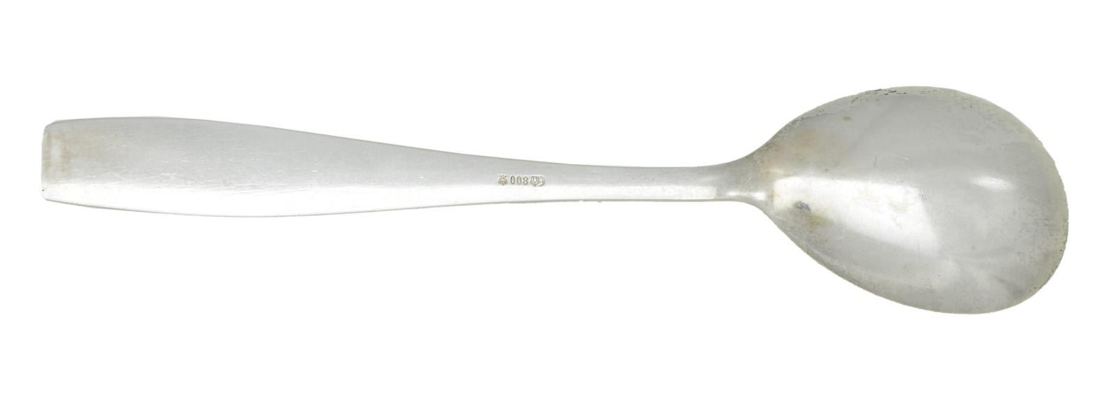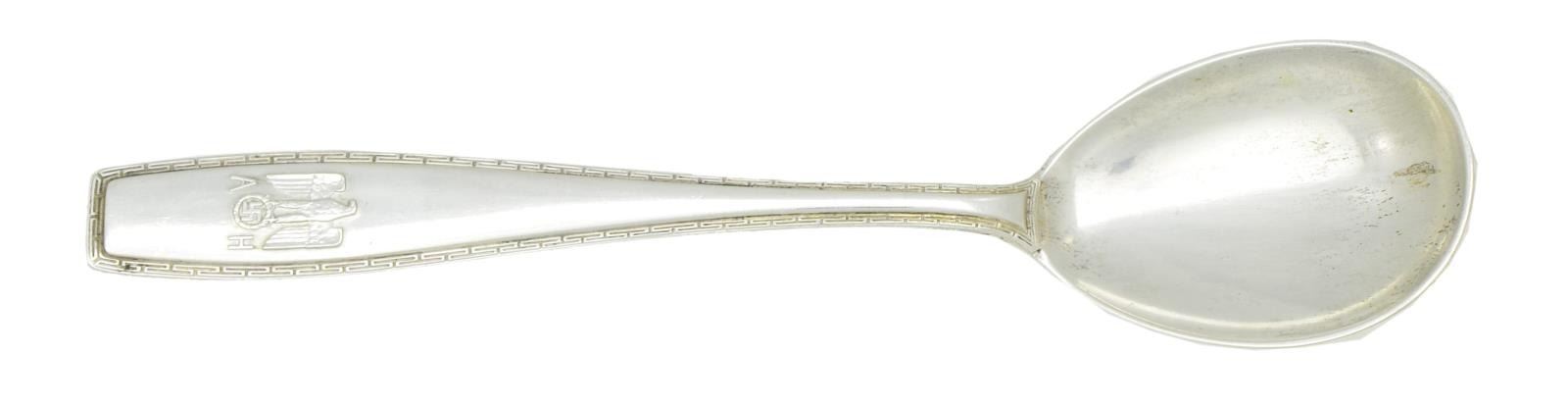 This spoon, made by Brückmann & Sohne of Heilbronn, Baden-Württemberg, measures 5 9/16" in length. The spoon has a 1 13/16" bowl and a modified Greek key-like border. The flat of the handle has a droop-wing German eagle perched on a wreath that surrounds a party symbol. The letters “A” & “H” flank the wreath. The reverse of the spoon is plain and stamped “(crescent moon) (crown) 800 (Prussian eagle)”. CONDITION: the spoon shows light overall wear with a lightly tarnished patina. (02-19034-5/BF). $1,200-1,500.