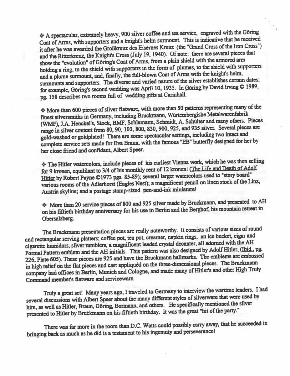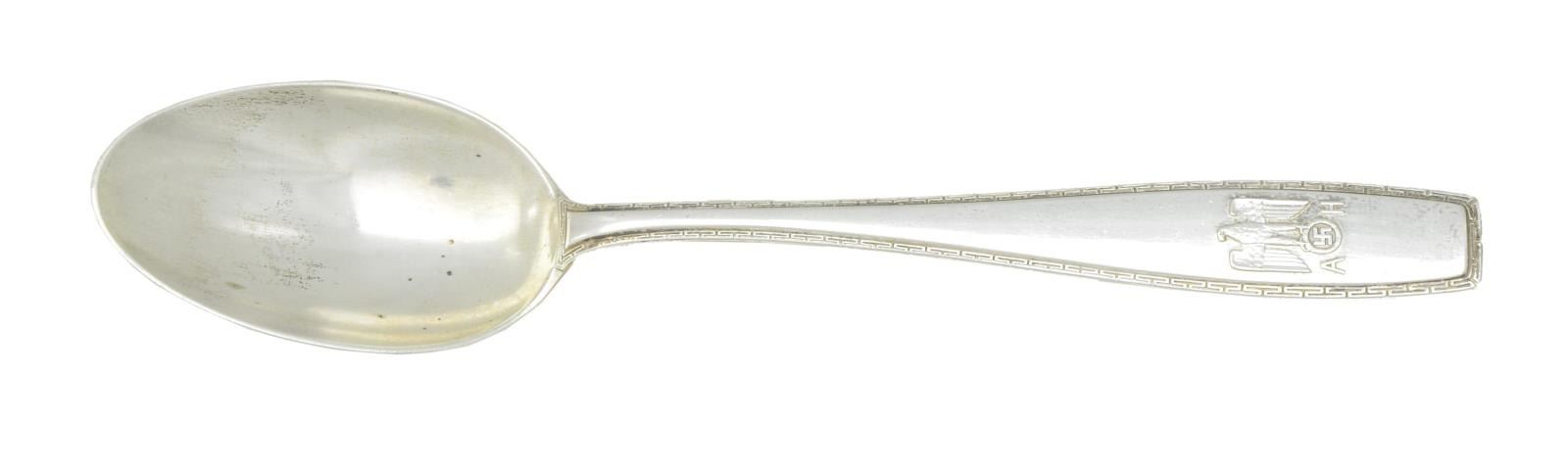 This spoon, made by Brückmann & Sohne of Heilbronn, Baden-Württemberg, measures 7 3/8" in length. The spoon has a 2 1/2" bowl and a modified Greek key-like border. The flat of the handle has a droop-wing German eagle perched on a wreath that surrounds a party symbol. The letters “A” & “H” flank the wreath. The reverse of the spoon is plain and stamped “(crescent moon) (crown) 800 (Prussian eagle)”. CONDITION: the spoon shows light overall wear with a lightly tarnished patina. (02-19034-4/BF). $1,200-1,500.