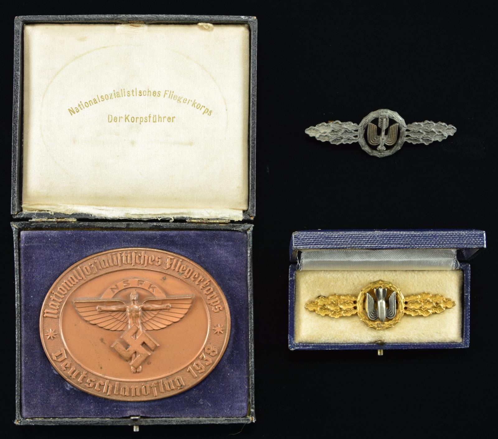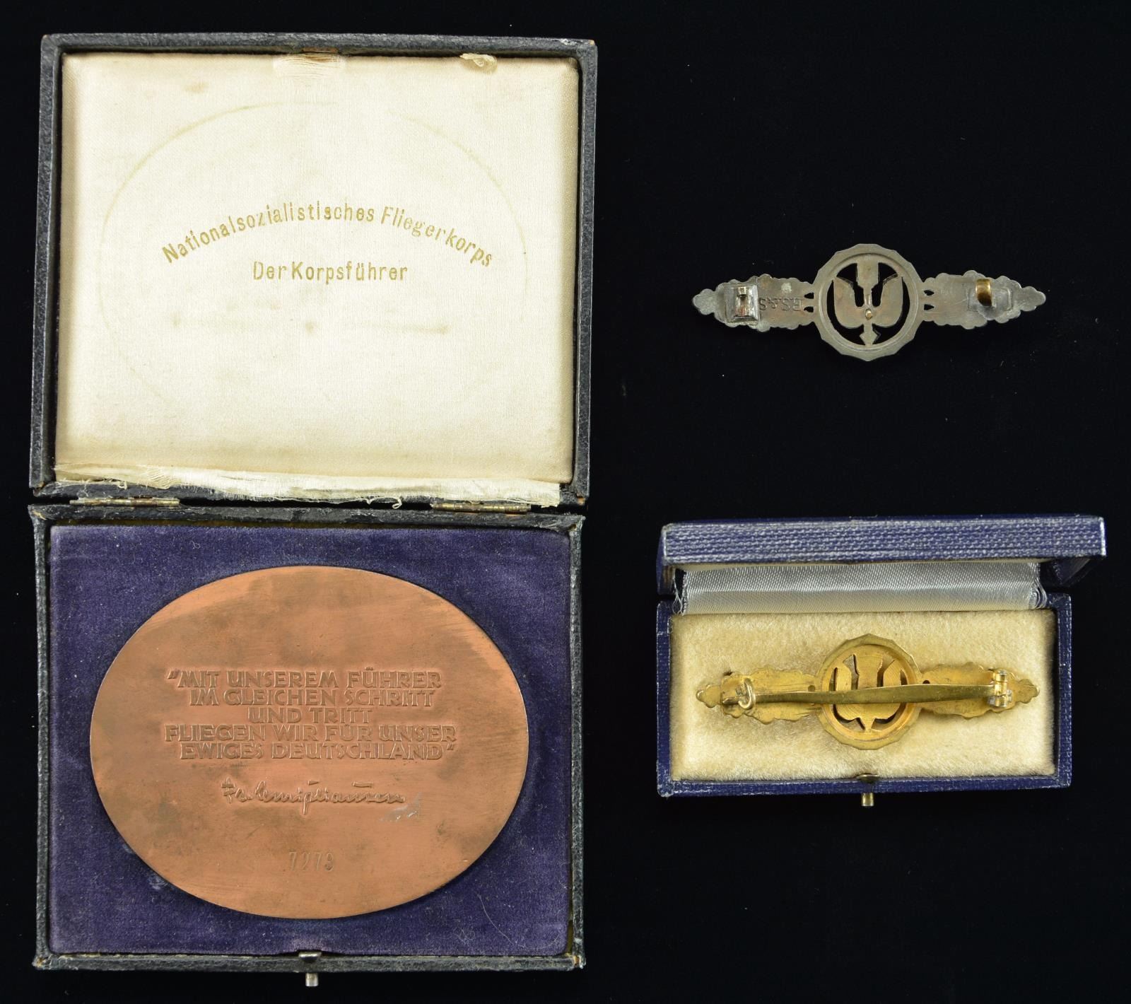 3) NSFK. A fine oval desk medal for the NSFK in its original award box. The medal measures approx. 3 3/4" x 3”. It pictures the NSFK insignia on the front with the words “Nationalsozialistisches Fliegerkorps * Deutschlandflug 1938 * “. The reverse reads “MIT UNSEREM FUHRER IM GLEICHEN SCHRITT UND TRITT FLIEGEN WIR FUR UNSER EWIGES DEUTSCHLAND”. The medal bears a facsimile signature and the serial number “7273”. The black leather covered case has a blue velvet interior with a white pad in the top. CONDITION: medal & case both show light wear. PROVENANCE: From the Lifelong Collection of Glen E. Mattox. (02-18306/BF). $600-900.