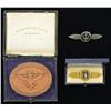 1) BOMBER PILOTS. A fine example of a gold Squadron clasp for a WWII German Bomber Pilot. Clasp has a gold finished wreath with a party symbol at the base flanked by 9 oak leaves on each side. The center has a silvered winged bomb. The reverse shows single rivet construction and a wide pin. The clasp is housed in its original blue leather covered box with gold writing on the top that reads “Frontflugspange fur Kampfflieger gold”. CONDITION: clasp shows light overall wear. The pin is complete but slightly misshaped. Box shows light wear.
