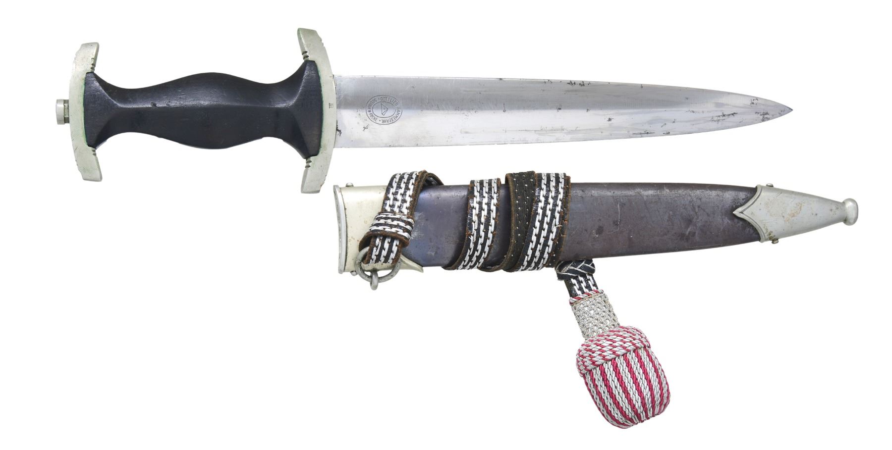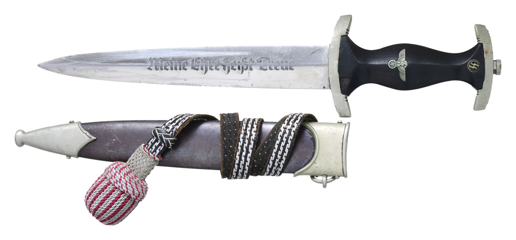 The overall length of this dagger 14 5/8". The blade is etched "Meine Ehre Heisst Treue" and is marked on the reverse "GOTTLIEB HAMMESFAHR (logo) SOLINGEN FOCHE". Nickel silver crossguard stamped "III" on the reverse, is paired with a nickel silver pommel guard. The black wooden grip has a nickel silver eagle and a black enamel SS button. Black anodized scabbard with nickel silver mounts and incorrect, but original, fire department knot is attached to the scabbard. CONDITION: blade shows primarily scabbard wear with a few spots of discoloration. Hilt shows light wear. Grip has a chip on the lower front. Scabbard finish is somewhat oxidized and worn and there are a few tiny dents on the mounts. Knot shows light wear. (02-24300/BF). $1,500-2,000.