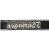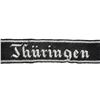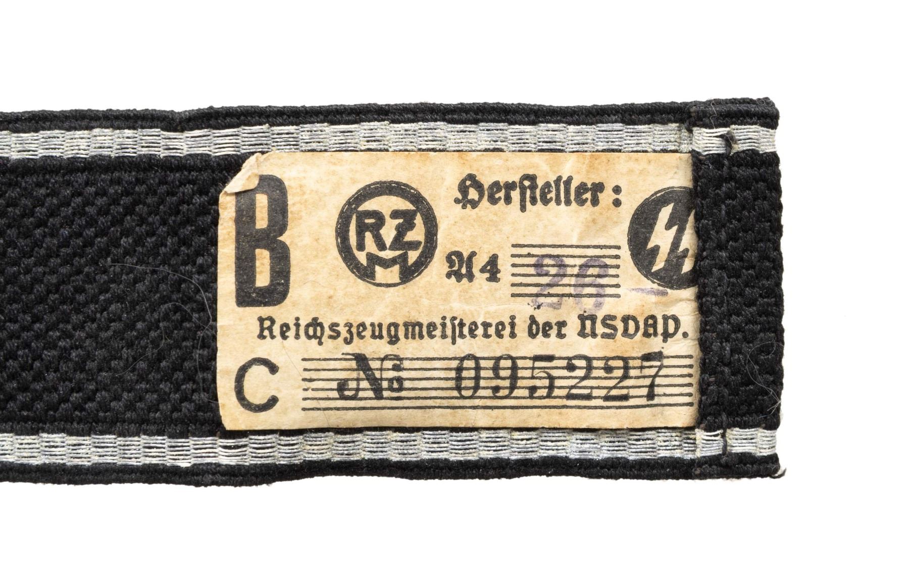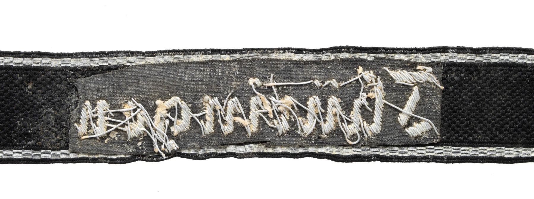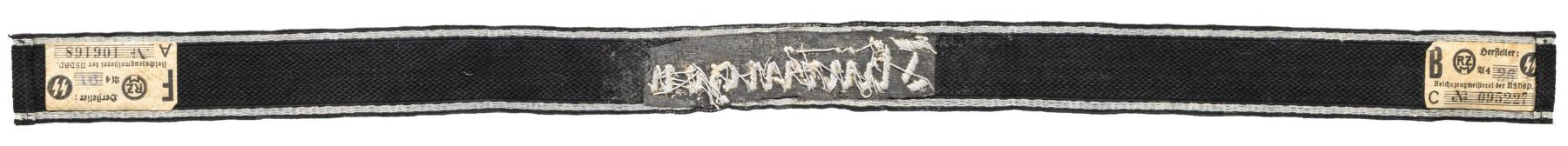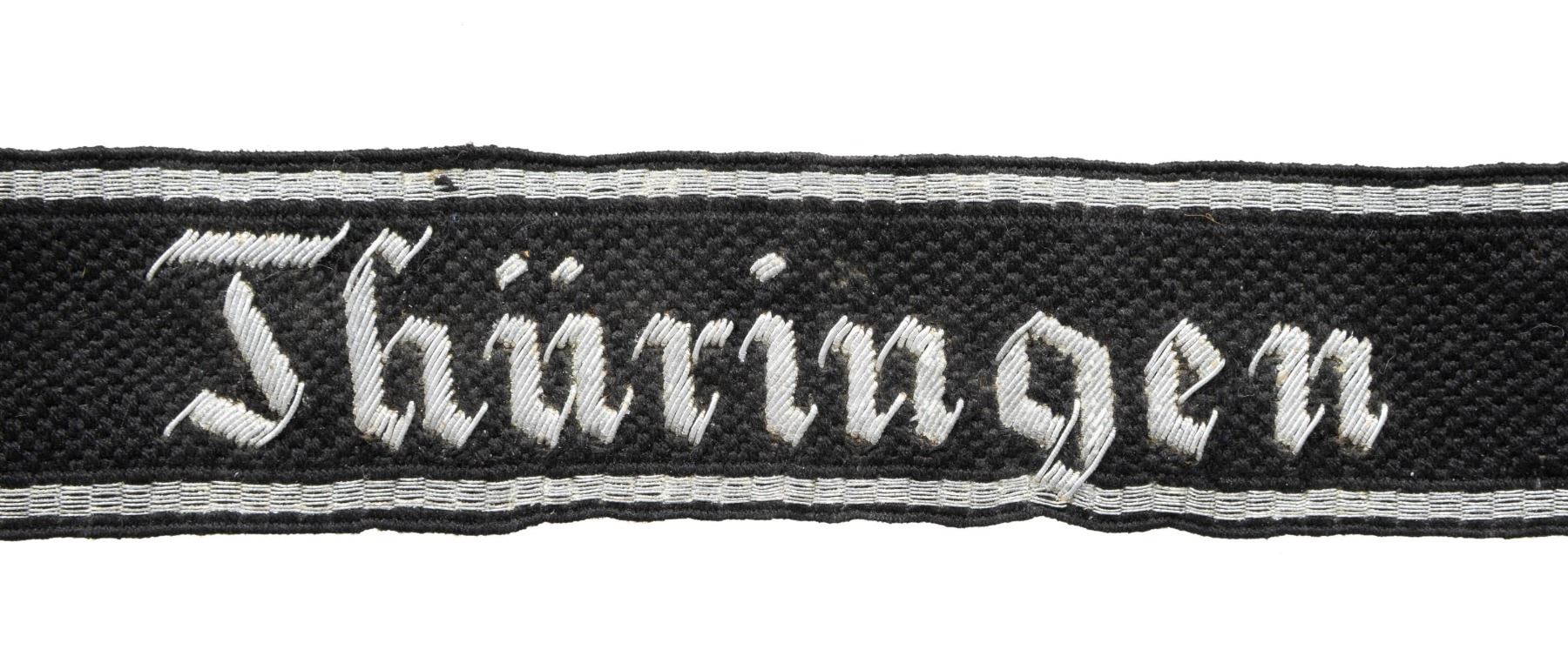 AND A CUFF TITLE. This lot consists of several WWII German SS items that are of questionable authenticity. We have had differing opinions on these items which often occurs with WWII German items. Please use your own judgment as to the period of manufacture of the following items. 1) A pair of 1st Lieutenant shoulder boards having a black felt background with a bright green border for mountain troops. The tops are silver bullion with a single pip attached. 2) A pair of Captain shoulder boards having a black felt background with a brown border for concentration camp troops. The tops are silver bullion with 2 pips attached to each board as well as "III" insignia for the 3rd SS Division. 3) A pair of collar tabs in black velvet bordered with silver bullion having paper RZM tags on the reverse. One tab is blank and the other has 3 pips above two parallel bullion stripes. 4) A black and silver bullion cuff title the reads "Thuringen". The reverse has 2 paper SS RZM tags. CONDITION: all items show light wear. The ends of the Captain boards show moderate wear. RZM tags are a bit discolored and one has minor losses. (02-24480-4/BF). $500-1500.