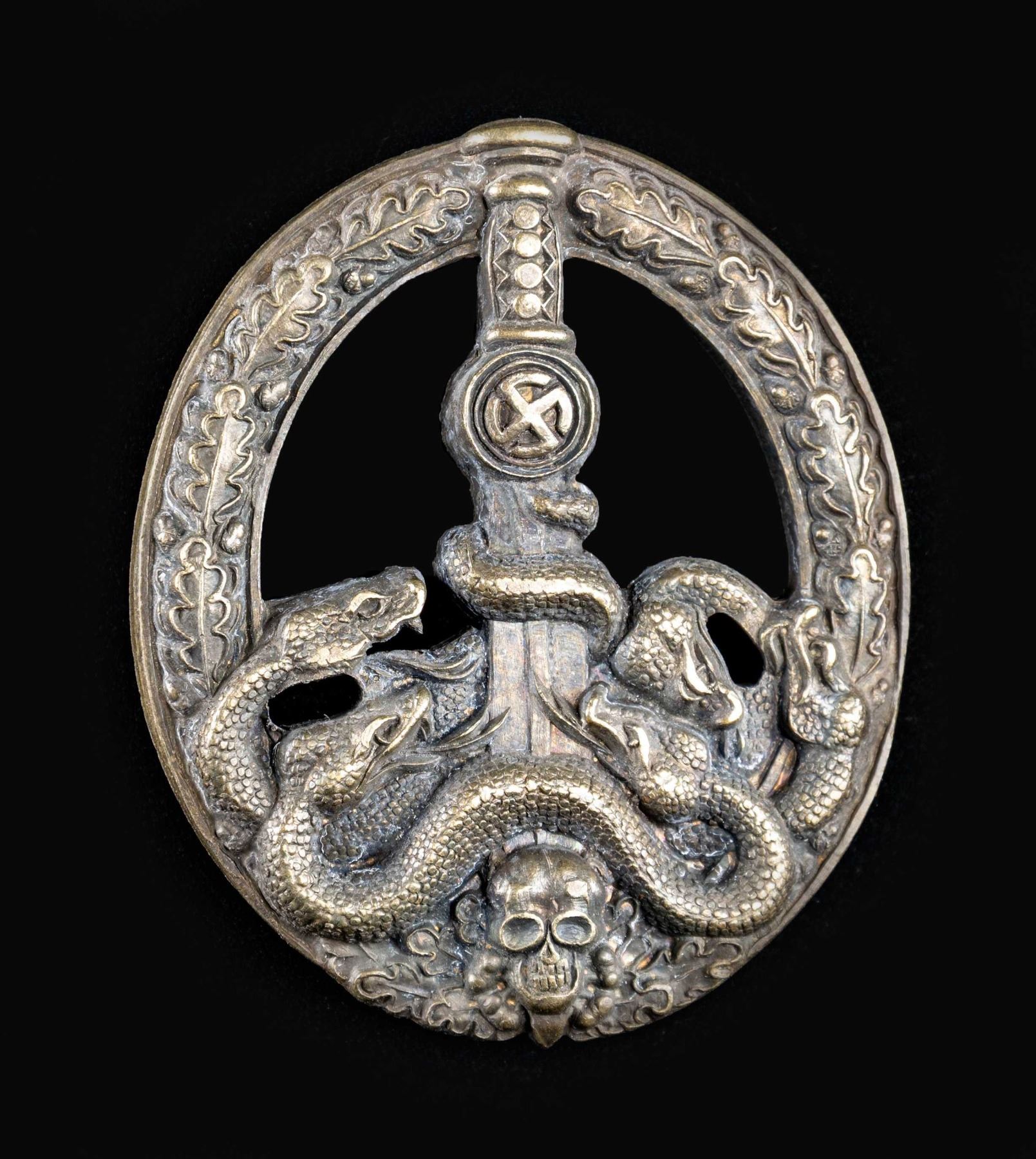 A quality reproduction of a bronze WWII German Anti Partisan Badge with a wide pin on the reverse. CONDITION: light wear overall. PROVENANCE: Estate Collection of John "Jack" Dhooghe. (02-25576/BF). NON-GUN. $50-100.
