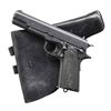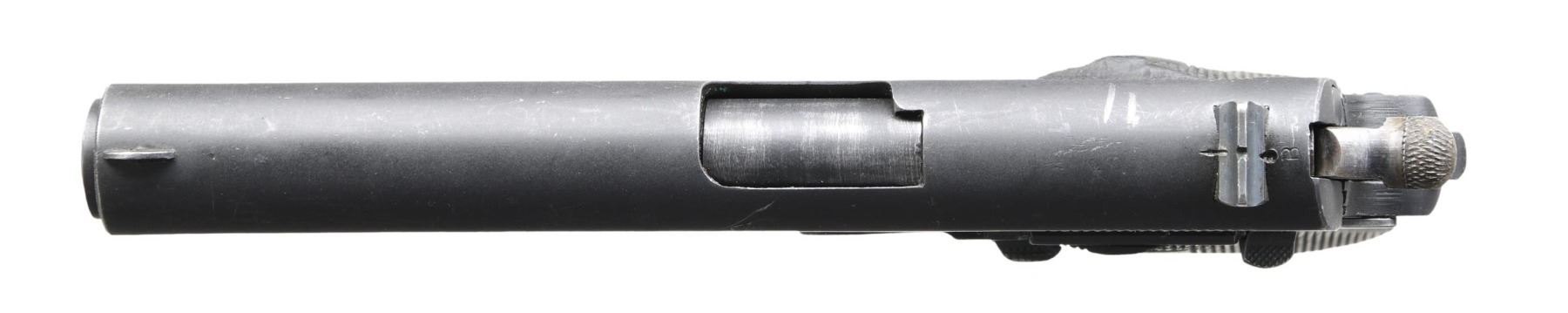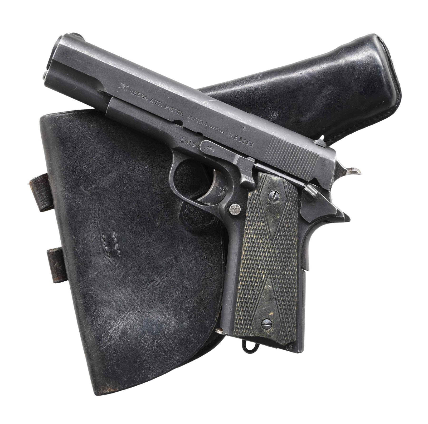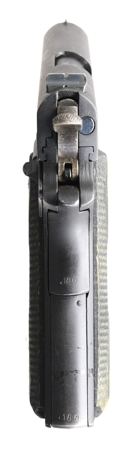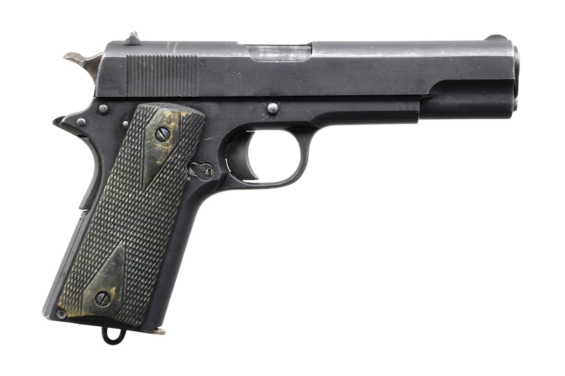 PISTOLE 657(n) SEMI AUTO PISTOL WITH BLACK HOLSTER. Cal. 11.25mm (45 ACP). S# 30188 (1945). In June 1940, the Knogsberg factory was commandeered by invading German forces. During 1945, The Germany Army Weapons Office order production of pistols in preparation for an Allied invasion of Norway. The Norwegian Model 1914 pistol was given the designation of the Pistole 657(n) & mfg. under German supervision. Per "Colt .45 Government Models (Commercial Series)" by Charles Clawson, "921 were Nazi proofed in the serial number range from 29615 to 30535". Safety lock & ejector not numbered along with grip safety non matching "186"; other parts matching numbered including 5" barrel having German firing proof on lug. Slide with correct Kongsberg crest (used from 1945-1947), German Waffenamt, dated "1945" & stamped with dot & "B" behind rear sight. Frame with script "JB" proof on triggerguard; Jorgen Bjornholt was a civilian sub-inspector forced into to be control officer by the Germans. Frame has "GU INC OMAHA NE" import mark under two piece checkered birch grips. MAGS: 1 nickel plated 7 rd. with blued base having lanyard loop. UNATTACHED ACCESSORIES: black leather holster showing light wear & marks. CONDITION: pistol has good phosphate finish showing numerous light marks & scratches. Good grips with marks that pierce through the finish. Good bore with wear to rifling. (24-5547/MD). CURIO. $6,000-8,000.