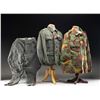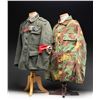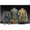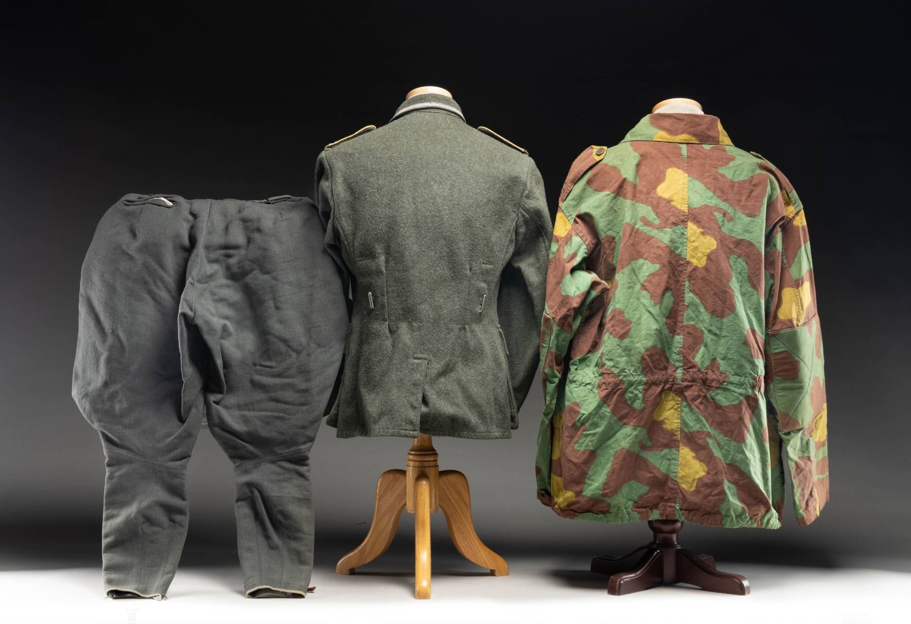This lot contains both real and reproduction items that have likely been used as costumes at one time. The first item is an original winter weight army 6 button tunic with original corporal shoulder straps and collar tabs. The breast eagle is original but likely added later. There are 2 button hole ribbons for the Iron Cross and Russian Front medal. A 4 award WWI medal bar, with no medals, has been added along with a WWII ribbon bar for the War Merit cross with Swords. There is an original Party armband on the left sleeve that has been sewn many times. The second item is a post WWII Italian Army camouflage jacket with a Luftwaffe breast eagle. Lastly, there is a pair of military style pants that appear to be East German or Russian in origin. CONDITION: tunic show light wear with some moth evidence. Camo has light wear. Pants show moderate wear. (02-25620/BF). NON-GUN. $400-700.