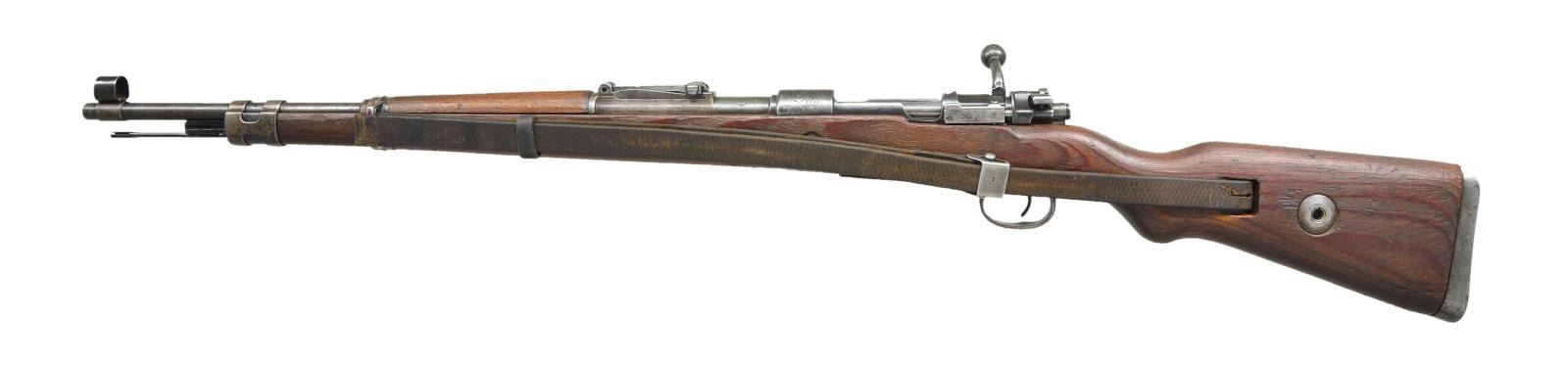 MODEL 98K BOLT ACTION MILITARY RIFLE. Cal. 8mm Mauser. S# 1189e. Bbl. 23 5/8" import mark on bottom of bbl. All visible numbers match. Receiver ring is marked on top "dou 44" & German eagle acceptance mark. Marked on left side of bbl. & receiver w/ German eagle proof. Left receiver rail marked "Mod. 98". Tangent rear sight graduated to 2,000 meters. Inverted V front sight w/ protective hood. Cleaning rod & bayonet are present. Milled open upper band. Stamped lower band. Bands retained by single spring. Stamped trigger guard & floorplate. Laminated stock set w/ cup type buttplate & steel disassembly disk. Original German leather sling. CONDITION: stock set has moderate wear, dents, staining & scratches throughout. Buttstock has notable surface cracks on both sides. Notable 2" crack behind receiver tang. Metal has turned mostly gray w/ patina & moderate wear, oxidation & handling marks throughout. Bore is dark w/ worn lands. PROVENANCE: from Estate collections of Charles P. Obremski. (22-1392/RW). CURIO. MODERN. $ 400-600.