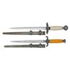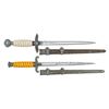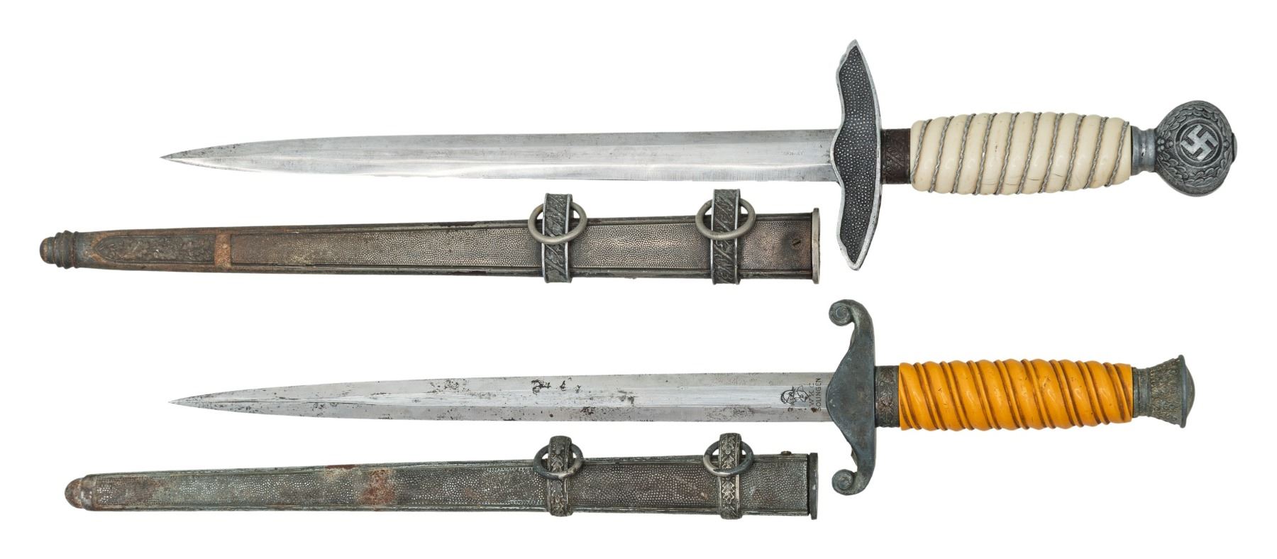 1) WWII German Army dagger measuring 15 3/4" overall with a plain blade marked "(logo) WKC SOLINGEN". Plated eagle crossguard with oak leaf embellished pommel and ferrule. Light orange grip and a plated scabbard. CONDITION: blade has a few dark spots but would improve greatly with a proper cleaning. Mounts show loss of plating and some oxidation. Grip is undamaged. Scabbard is sound with substantial loss of plating and oxidation. 2) Post WWII German Luftwaffe souvenir dagger measuring 16 7/8" overall with a plain blade marked "SOLINGEN 1939 B & A (2 ways in a cross)" & "GERMANY" on the opposite side. Aluminum eagle crossguard with oak leaf embellished pommel. Cream colored grip with wire wrapping and a plated scabbard. Daggers like this example were made up after the war and sold to GIs as souvenirs. Generally, the blade and scabbard were made from 1946-47 and the remaining parts were wartime production. CONDITION: blade shows minor scabbard wear. Mounts show tarnish and traces of oxidation. Grip is undamaged. Scabbard is sound with some loss of plating and oxidation. (02-26163/BF). NON-GUN. $600-800.