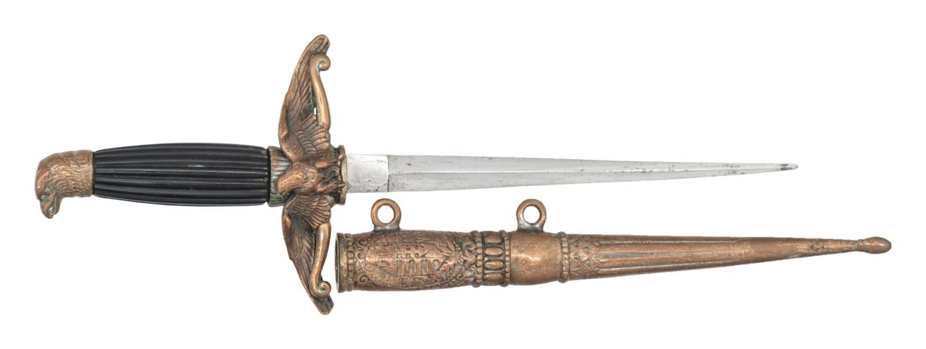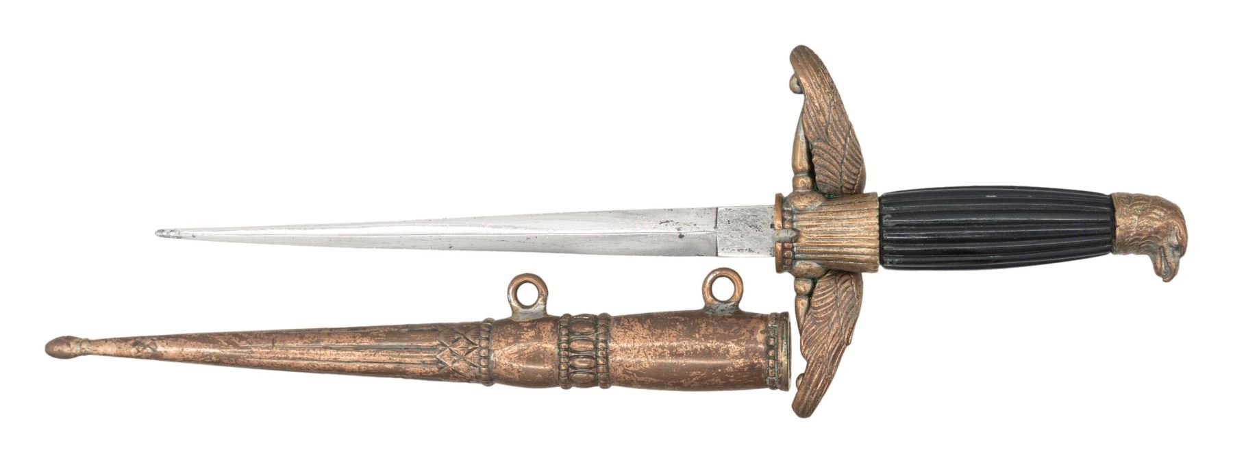 A scarce WWII Hungarian Air Force officer's dagger measuring 15 1/8" overall with a plain unmarked blade. The blade appears plated and has a raised medial ridge. Lightly gilded hilt with a large heavy eagle crossguard. The pommel is in the shape of an eagle's head. Dark vertically reeded grip. Gilded cast metal scabbard. CONDITION: plating on the blade is peeling slightly and most of the gilded finish has worn off the hilt. Grip is undamaged. The small catch on the reverse of the crossguard is missing. (02-24935/BF). NON-GUN. $400-700.