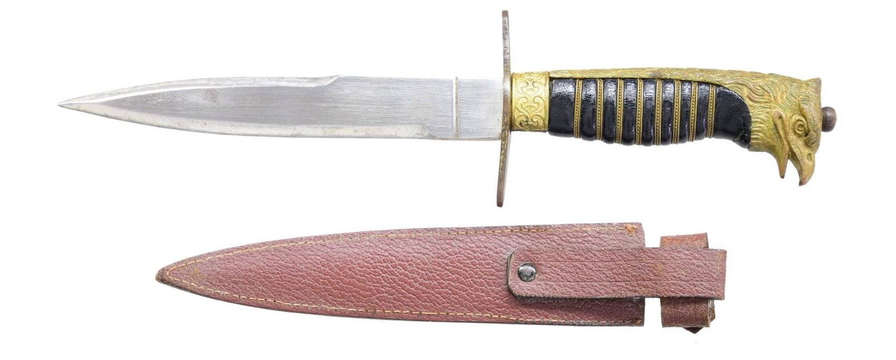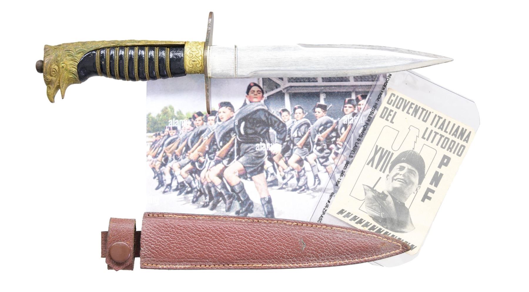 This lot features a WWII Italian fascist youth dagger measuring 11 3/4" overall with a 6 1/2" blade. Plain blade with a 4" false edge. Gilded brass hilt with a plain guard. Eagle-head pommel with feathered backstrap and scroll-decorated ferrule. Wire-wrapped, black-finished wood grip. Brown leather scabbard. Together with the dagger is a small ID card for the Fascist Youth Organization for a boy born in 1936. CONDITION: dagger generally shows light wear; however, the edge does show evidence of sharpening. The ID card shows light wear with minor discoloration. (02-21126/BF). $400-600.