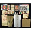 This scarce & interesting group includes 1 canvas & metal explosives carrier. / 1 Large 6 1/2 liter aluminum water carrier. / 1 Model 1907 wooden canteen. / 1 M1934 Beretta lanyard. / 2 Leather Carabinieri cartridge pouches. / 2 Pith helmet cockades. / 1 Mess kit. / 3 Oval glass flasks used as canteens. / 1 Commemorative medal for the Expedition to Fiume 1919. / 3 M1939 combat knives with scabbards. / 2 M1938 scabbards for folding bayonets. / 1 Italian flag measuring 23 1/2" x 18". / 1 Small Italian pennant. / 1 Map of Italy on cloth dated 1918. / 1 Blue covered canteen. / 1 Green covered canteen with cup. / 1 Gray covered canteen. / 1 M1935 gas mask with pouch. / Approx. 74 pieces of paper ephemera. / 1 Brixia mortar bomb. / 1 Italian M35 smoke grenade. / 3 White leather cartridge boxes. / 1 WWI pair of wire cutters. / 1 Framed commemorative medal for the Expedition to Fiume 1919 with award documents. Documents are discolored & medal ribbon is badly faded. CONDITION: all items show light to moderate wear except as noted. (02-16404-1/BF). $700-1,100.