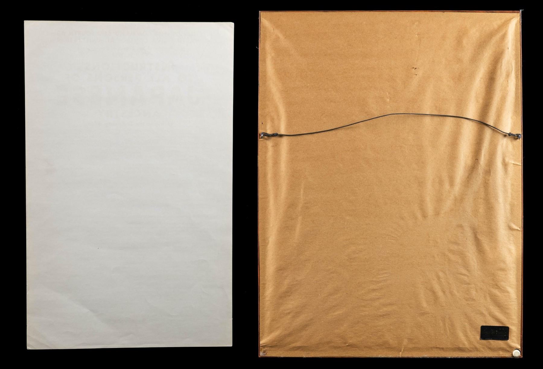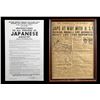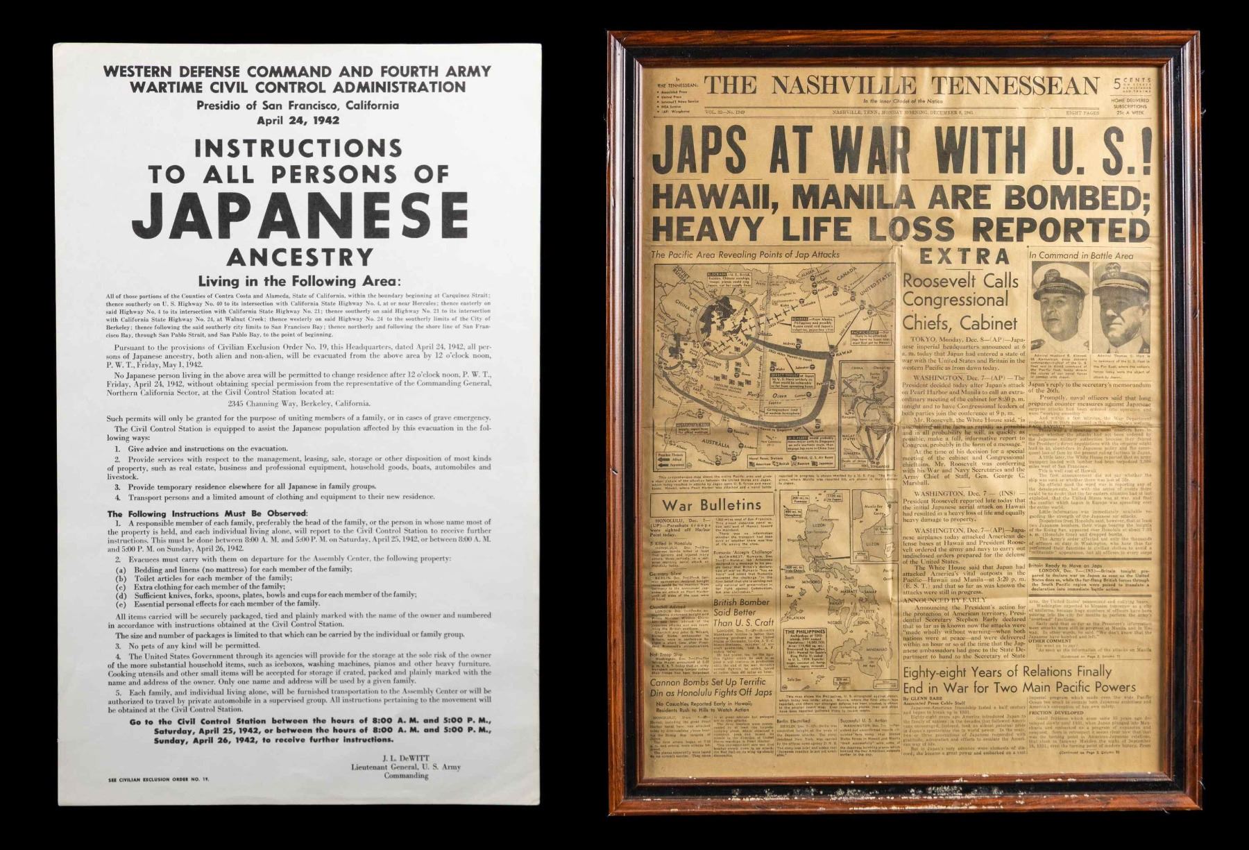 A rare and seldom seen original April 24, 1942 " INSTRUCTIONS TO ALL PERSONS OF JAPANESE ANCESTRY " issued by the Western Defense Command and the Fourth Army Wartime Civil Control Administration from the Presidio of San Francisco, CA. This is the original poster directing Japanese Americans to internment camps for the duration of WWII. Poster measures approximately 22" X 14" and has black letters on an off white field. The poster is signed " J.L. DeWITT Lieutenant General, U.S. Army Commanding. This lot also includes a framed newspaper titled " THE NASHVILLE TENNESSEAN " announcing the bombing of Pearl Harbor by the Japanese. The framed newspaper measures about 24 1/2" x 18 1/2". CONDITION: the interment poster shows very light wear and use. The newspaper is quite solid but has yellowed with age. (02-25020/BF). NON-GUN. $1,000-2,000.