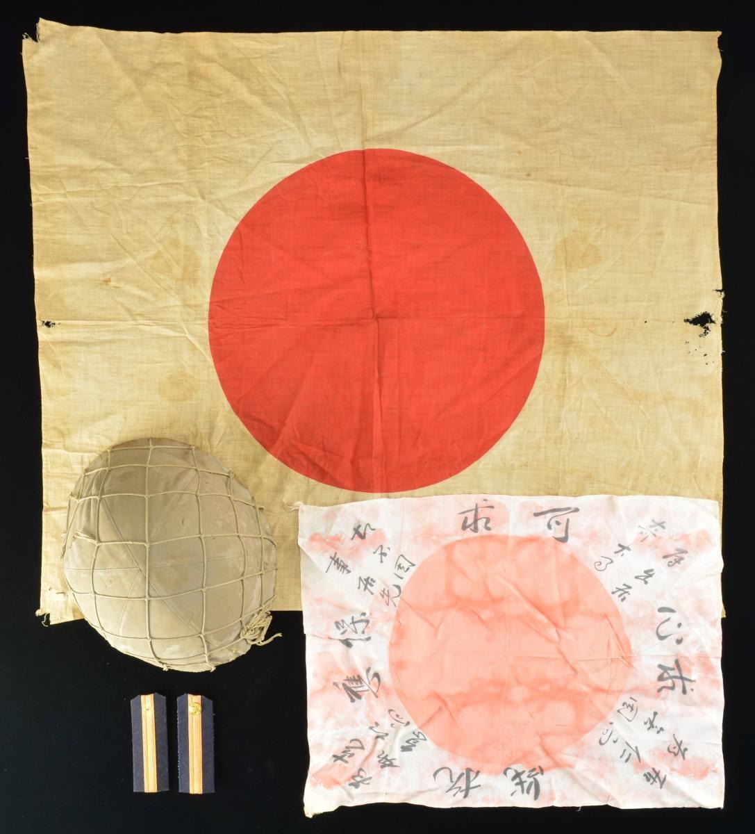 WWII JAPANESE HELMET, 2 FLAGS & SHOULDER STRAPS.