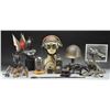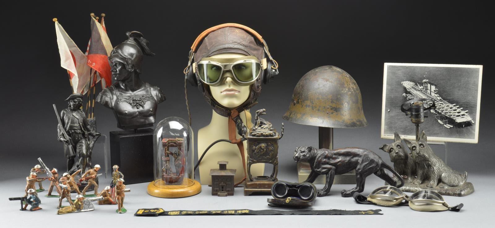 This varied group includes an original WWII Japanese helmet painted black w/ reproduction liner. / WWII Japanese Navy rank insignia & cap tally. / WWII Army Air Corps leather flight helmet w/ goggles & head phone. / Pair of aviator goggles. / Sm. cast iron schoolhouse bank. / 4 Japanese stick flags. / Photo of the USS Saratoga. / Pair of opera glasses in case. / 9" Bronze Chinese incense burner. / Cast metal lioness. / Cast metal Scotty dog lamp. / Cast metal 18th century hunter marked “HIVER”. / Sm. Chinese acrobatic carving in a globe. / 16" Tall bust of a Greek warrior on plinth. / 10 Cast metal WWI toy soldiers. CONDITION: all items show light to moderate wear. PROVENANCE: Collection of Brian C. Pinkerton. (02-15442/BF). $400-600.