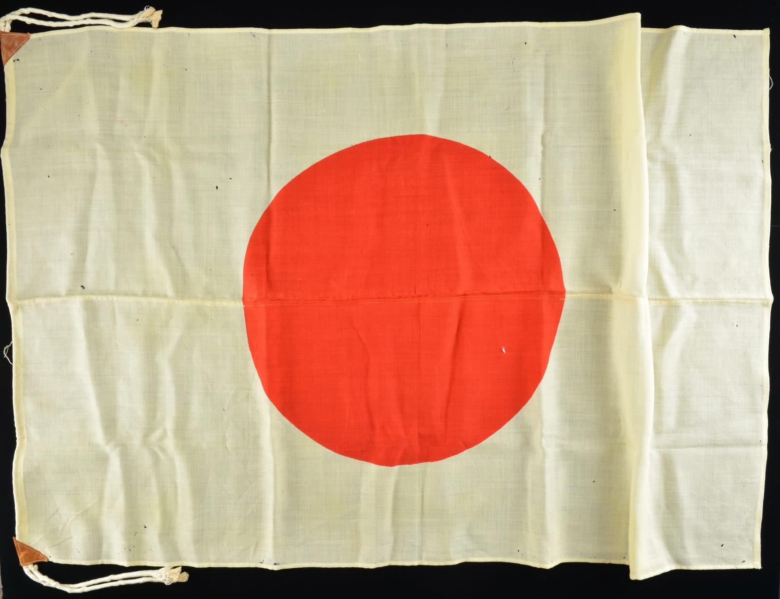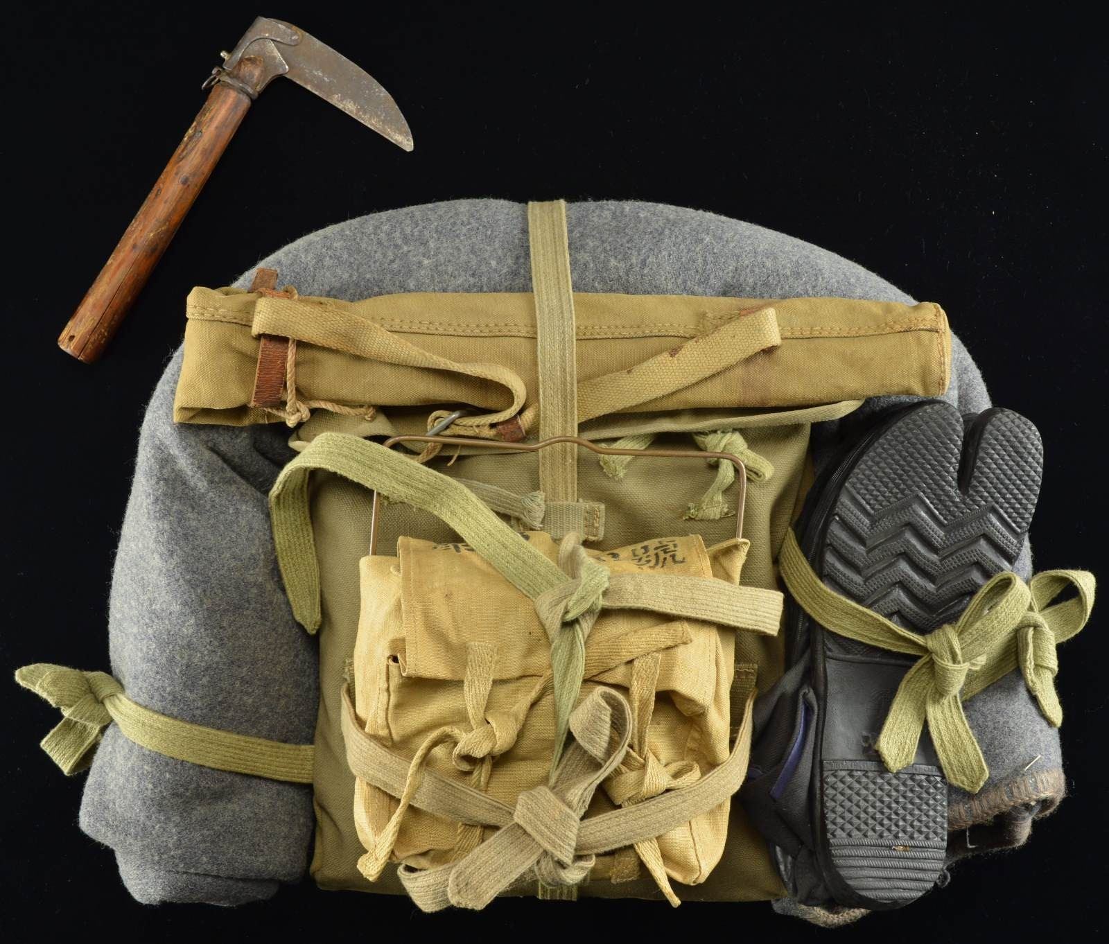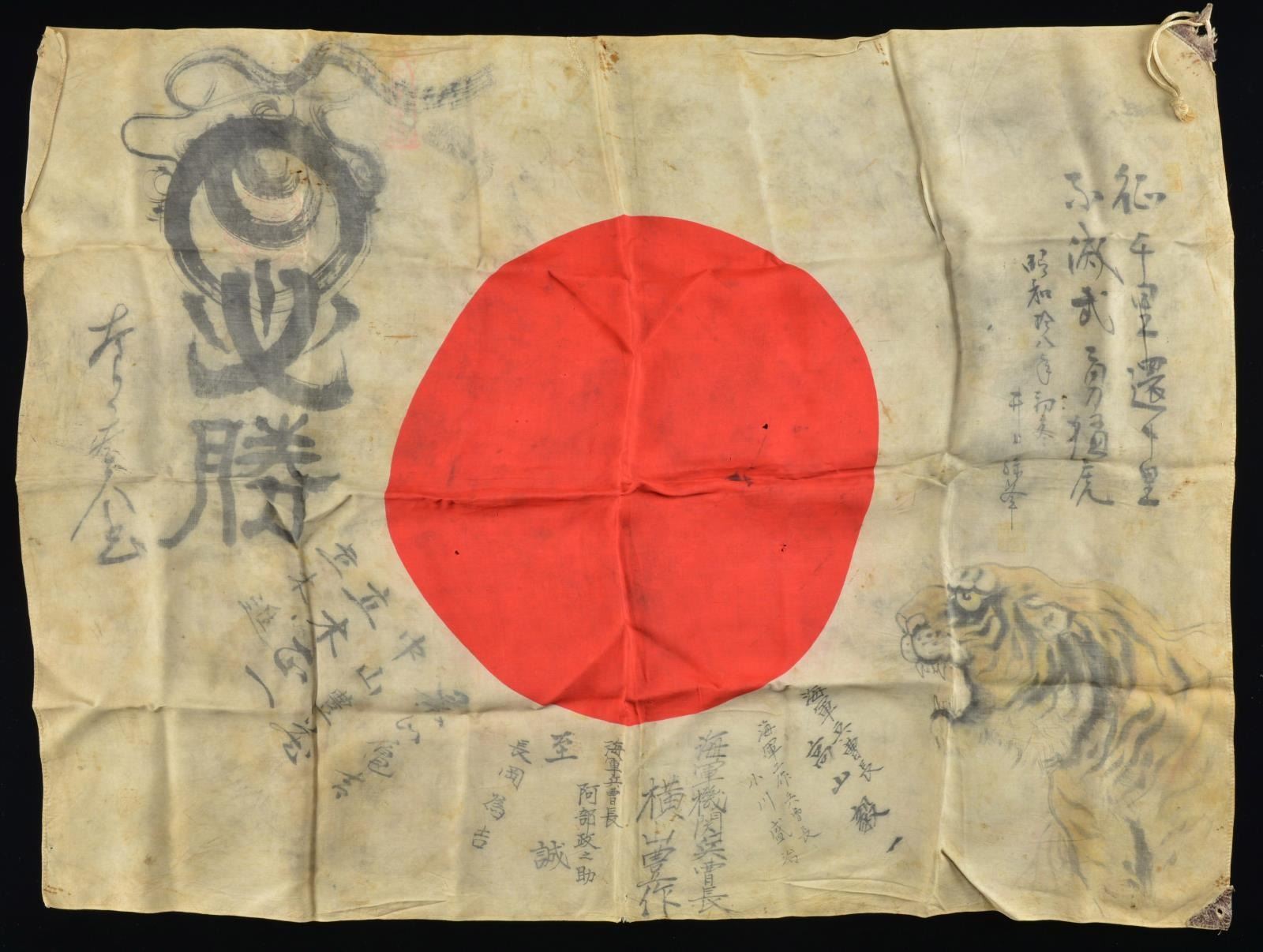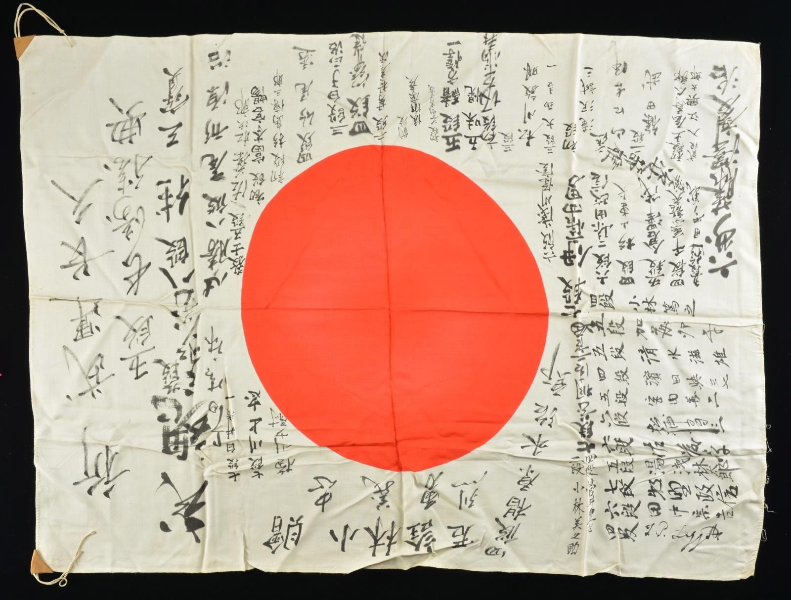 ITEMS. This varied lot includes: 1 large wooden equipment box measuring approximately 19” x 11” x 10”. Box has an aluminum tag on the top with numerous Japanese characters. Box also has black painted Japanese characters throughout. / 1 Complete backpack of green cotton canvas with a gray wool blanket, rubber shoes, a canvas bag containing rifle cleaning equipment, and a khaki canvas bag containing a mess kit. / 1 Japanese silk Hinomaru flag on collapsible handheld flagpole. / 1 Folding sickle used to clear brush. / 1 Large wool blend Hinomaru flag with corner ties. / 1 Medium sized Hinomaru flag with black ink prayers written throughout. / 1 Synthetic medium sized Hinomaru flag. / 1 Small Hinomaru banner with woodblock inscriptions. / 1 Silk Chinese nationalist flag. / 1 Medium sized silk rising sun flag. / 1 Large Hinomaru flag with a significant number of prayers written in black ink around border. / 1 Medium sized silk rising sun flag. / 1 Medium sized Hinomaru flag with prayers written in black ink around border. CONDITION: box shows expected scuffs & scrapes. Backpack and associated equipment show light wear. Flags vary in condition but generally show minimal damage and some staining. (02-16430/BF). $1,400-1,800.