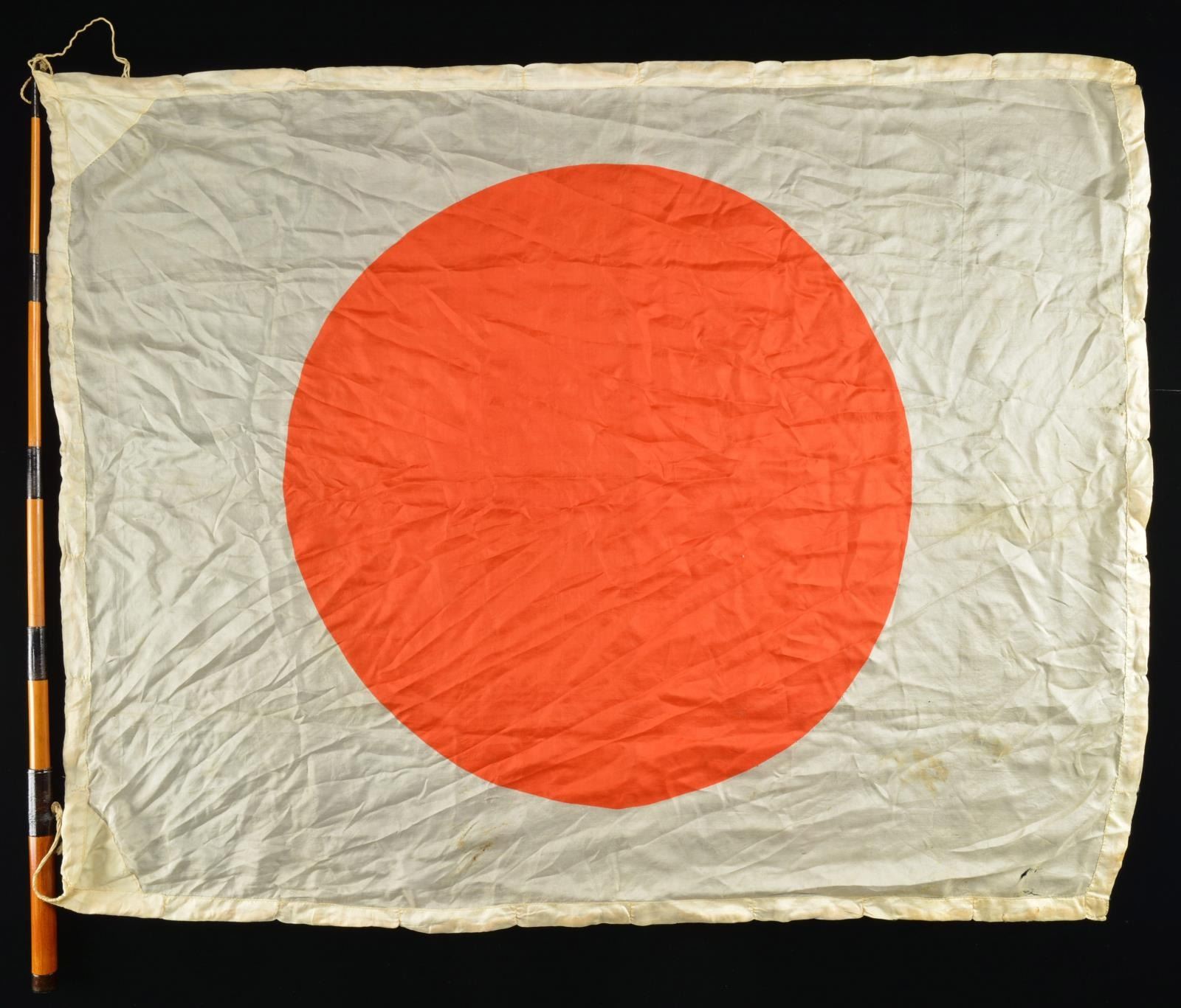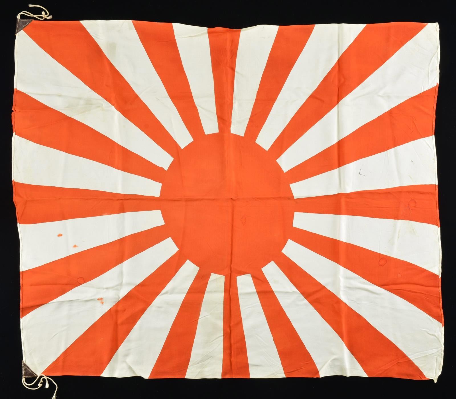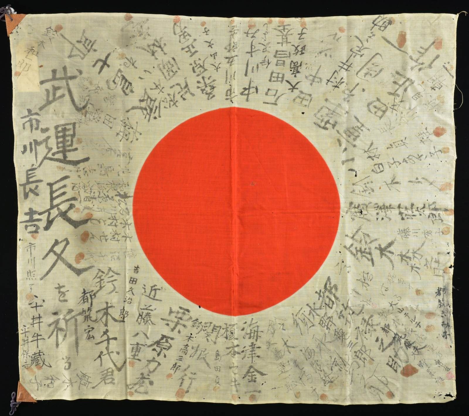 ITEMS. This varied lot includes: 1 large wooden equipment box measuring approximately 19” x 11” x 10”. Box has an aluminum tag on the top with numerous Japanese characters. Box also has black painted Japanese characters throughout. / 1 Complete backpack of green cotton canvas with a gray wool blanket, rubber shoes, a canvas bag containing rifle cleaning equipment, and a khaki canvas bag containing a mess kit. / 1 Japanese silk Hinomaru flag on collapsible handheld flagpole. / 1 Folding sickle used to clear brush. / 1 Large wool blend Hinomaru flag with corner ties. / 1 Medium sized Hinomaru flag with black ink prayers written throughout. / 1 Synthetic medium sized Hinomaru flag. / 1 Small Hinomaru banner with woodblock inscriptions. / 1 Silk Chinese nationalist flag. / 1 Medium sized silk rising sun flag. / 1 Large Hinomaru flag with a significant number of prayers written in black ink around border. / 1 Medium sized silk rising sun flag. / 1 Medium sized Hinomaru flag with prayers written in black ink around border. CONDITION: box shows expected scuffs & scrapes. Backpack and associated equipment show light wear. Flags vary in condition but generally show minimal damage and some staining. (02-16430/BF). $1,400-1,800.