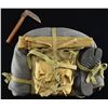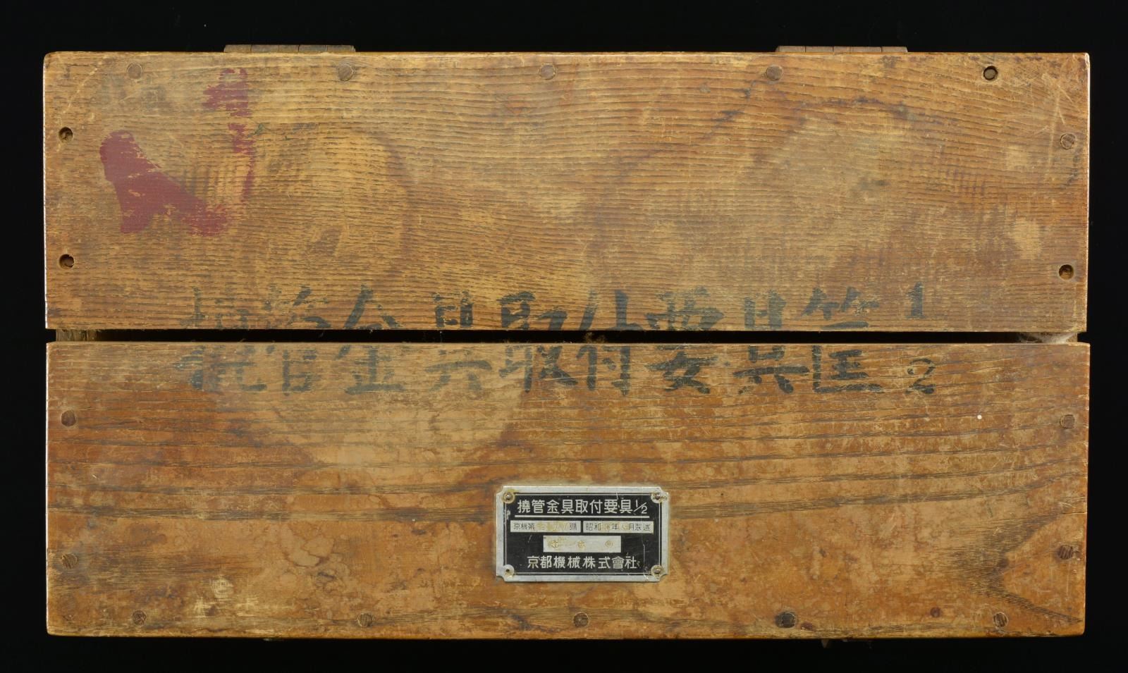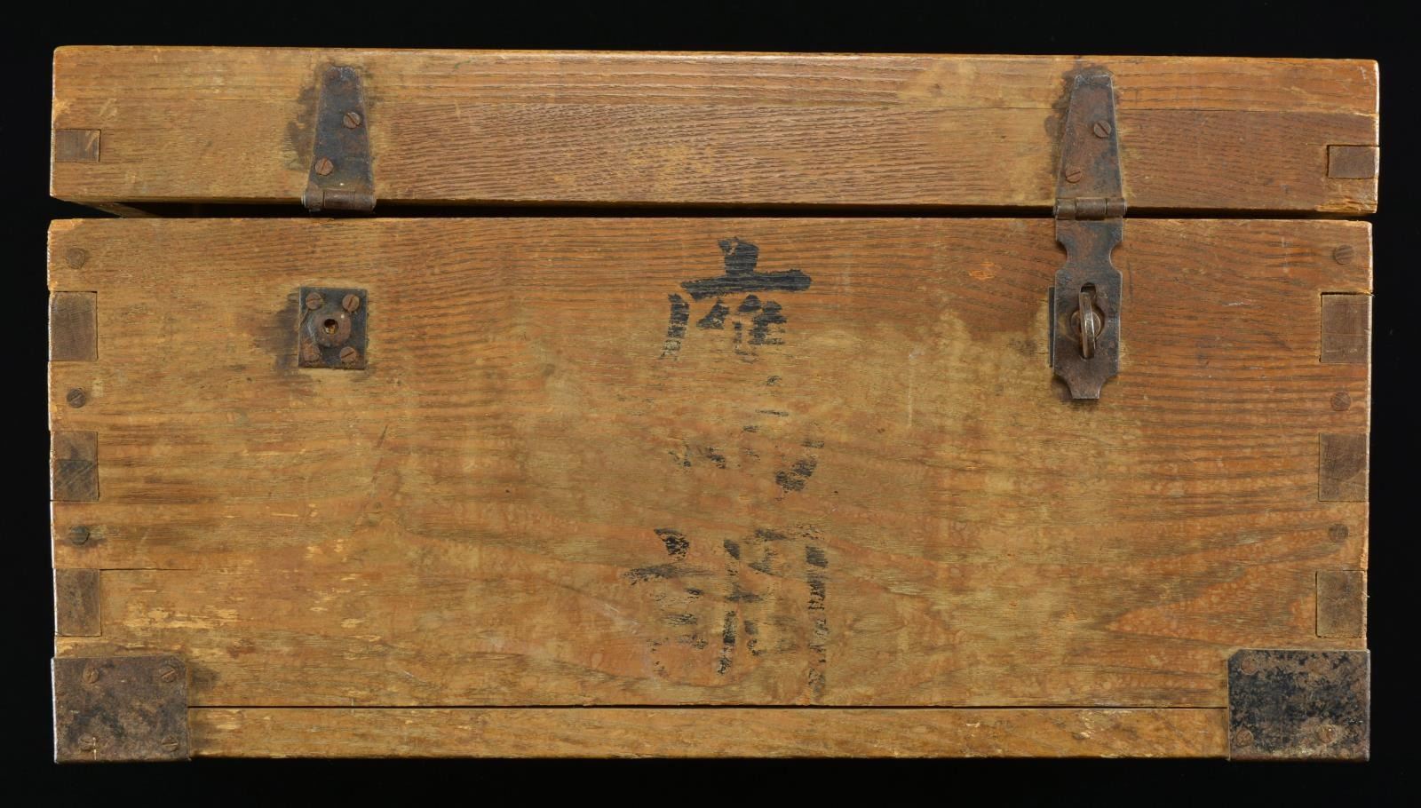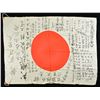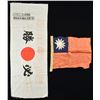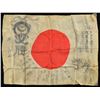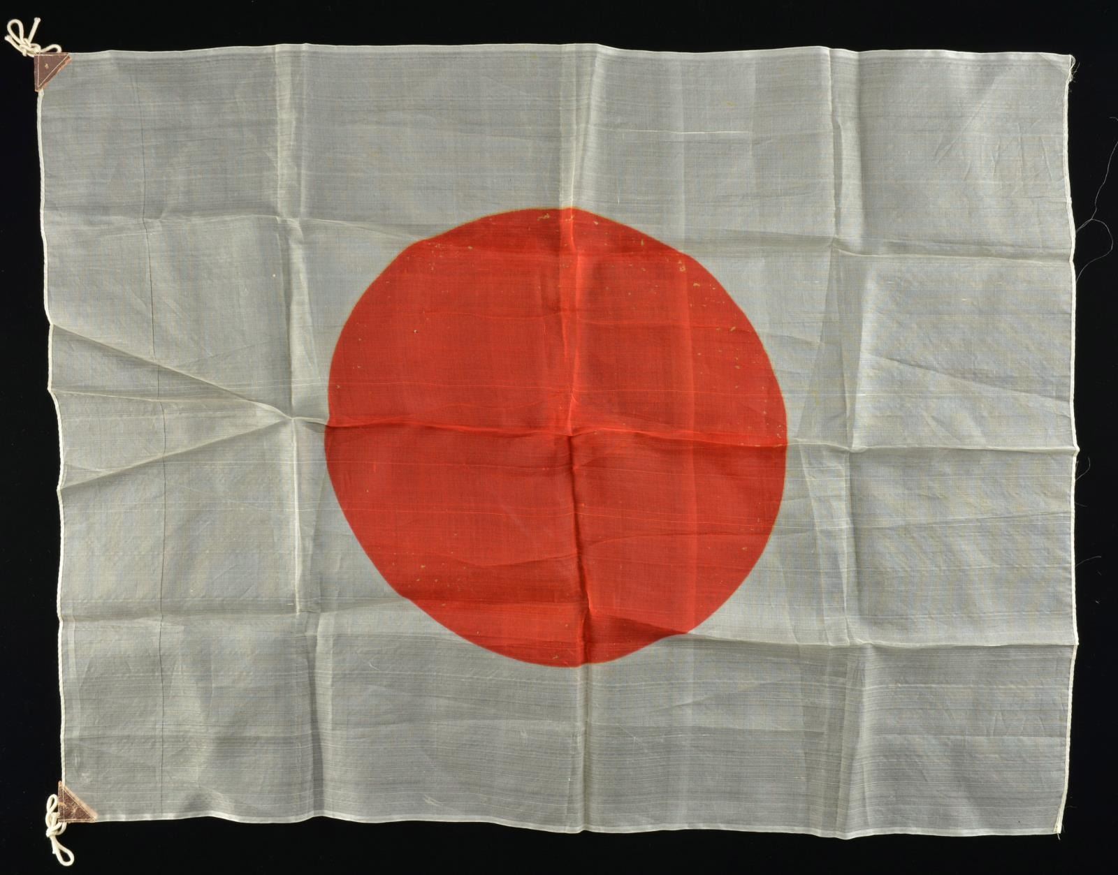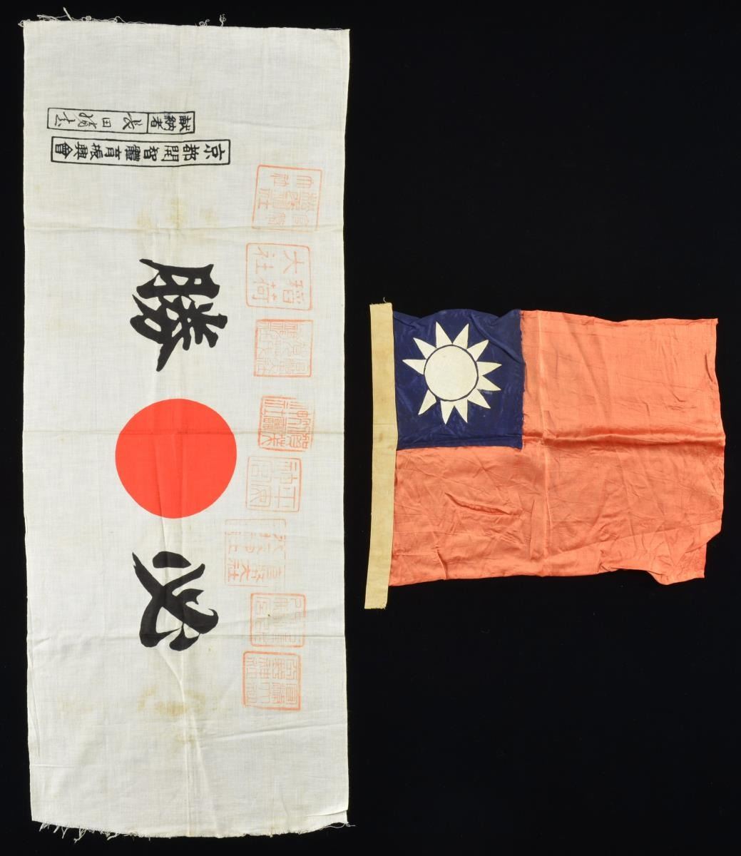 ITEMS. This varied lot includes: 1 large wooden equipment box measuring approximately 19” x 11” x 10”. Box has an aluminum tag on the top with numerous Japanese characters. Box also has black painted Japanese characters throughout. / 1 Complete backpack of green cotton canvas with a gray wool blanket, rubber shoes, a canvas bag containing rifle cleaning equipment, and a khaki canvas bag containing a mess kit. / 1 Japanese silk Hinomaru flag on collapsible handheld flagpole. / 1 Folding sickle used to clear brush. / 1 Large wool blend Hinomaru flag with corner ties. / 1 Medium sized Hinomaru flag with black ink prayers written throughout. / 1 Synthetic medium sized Hinomaru flag. / 1 Small Hinomaru banner with woodblock inscriptions. / 1 Silk Chinese nationalist flag. / 1 Medium sized silk rising sun flag. / 1 Large Hinomaru flag with a significant number of prayers written in black ink around border. / 1 Medium sized silk rising sun flag. / 1 Medium sized Hinomaru flag with prayers written in black ink around border. CONDITION: box shows expected scuffs & scrapes. Backpack and associated equipment show light wear. Flags vary in condition but generally show minimal damage and some staining. (02-16430/BF). $1,400-1,800.