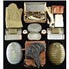 This interesting group includes 1 WWII era leather flight helmet. / 2 Wrap puttees with Japanese sewn on characters. / 1 Brown leather Arisaka cartridge box. / 2 Ceramic body hand grenades. / 2 Japanese officers rice cookers. / 1 Field radio in original wood & metal box. / 1 Brass hot water warmer known as a yutampo. / 1 Galvanized hot water warmer known as a yutampo. / 1 Brown leather backpack with sewn in star insignia. / 3 Mess kit tops. / 1 Mess kit bail. / 1 Green canvas carrying bag. / 1 Pair of slippers. / 1 Pair of white socks. / 1 Pair of mittens. CONDITION: most items show light to moderate wear. Bail is possibly excavated. Cloth items remain strong. (02-16409-2/BF). $600-800.
