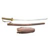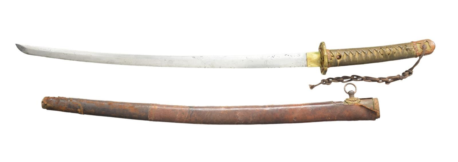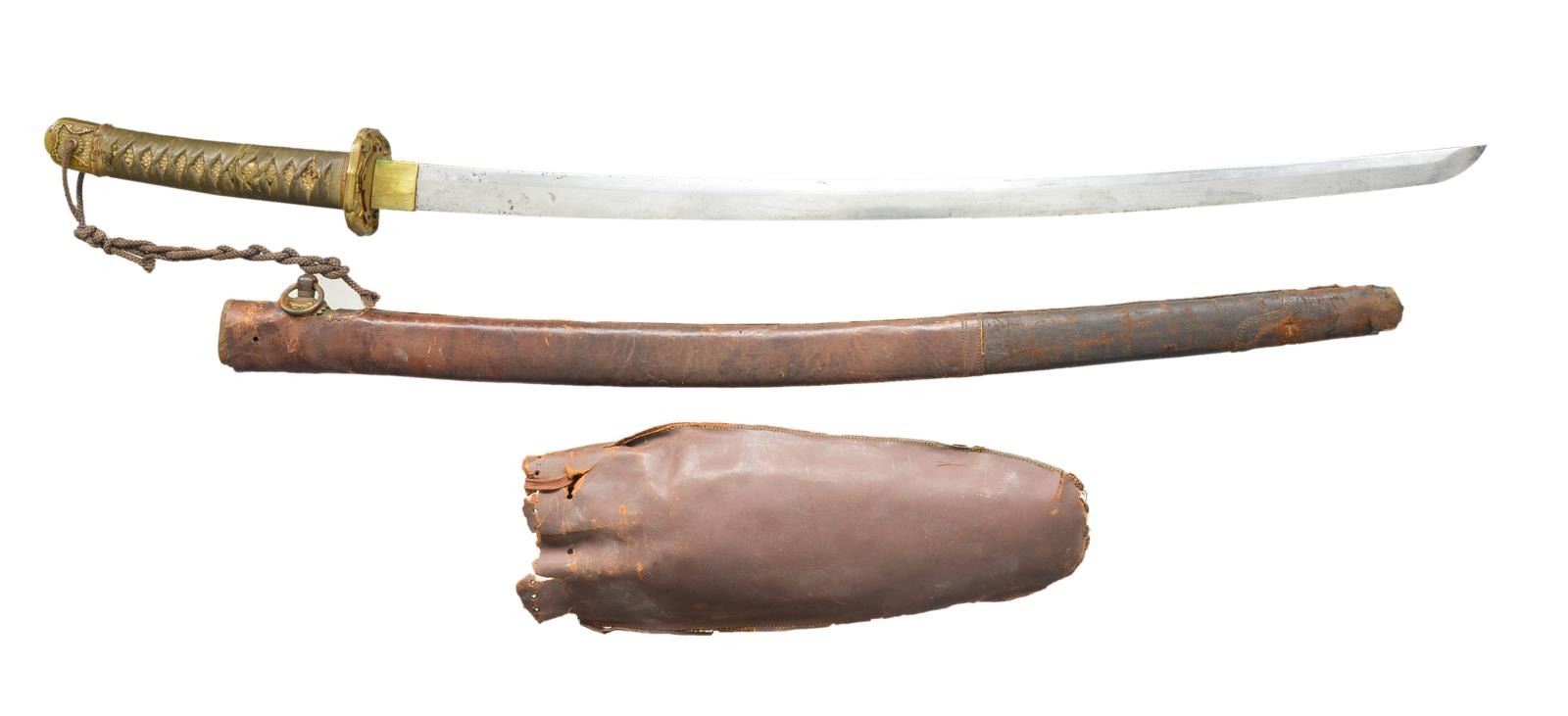 Overall length: 38 3/4". Blade length: 27". Blade has no discernible hamon. Brass habaki. Standard brass tsuba w/ 4 cherry blossom design on each side. There are 2 seppa below the tsuba & 1 above. Tsuka has matching military fuchi & kashira. White same. Brown/green tsuka-ito. Brass 3 cherry blossom menuki on each side. Blade has a single mekugi-ana. Blade has a 7 character signature on 1 side & a 2 character signature on the other. Saya is leather wrapped metal in the military style. CONDITION: blade has some scratches & a few very minor spots of pitting. There are a few dents to the edge but no chips are observed. The tsuka shows light to moderate wear overall. The saya shows moderate wear. (02-15883/BF). $300-500.