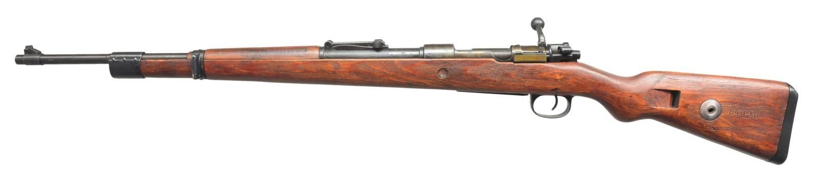 RIFLE. Cal. 8mm Mauser. S# 6492o. Bbl. 23 3/4". Import marked on right side of bbl. Receiver marked on left rail w/ gothic "MOD. 98". Receiver ring has German Eagle proof on left side. Receiver marked on top w/ German eagle "ce / 44 ". Right side of receiver has 2 partially legible waffenamts: "280" & "37?" Bbl. marked over chamber waffenamt "37". Marked on left side w/ poorly stamped "X" indicating Russian capture. Numbers match on receiver, bbl., & buttstock & bolt (by electro pencil). Tangent rear sight graduated to 2,000m. Inverted V front sight side. Stamped solid upper band. retained by screw. Rifle mfg. w/out bayonet lug. Forend tip has plate cap retained by screw. Stamped lower band. Stamped trigger guard w/ milled floorplate. Cup type buttplate. Steel takedown hole. Laminated stock w/ walnut handguard, is unmarked except for S# & "4" in sling slot. CONDITION: stock has arsenal rework type finish w/ moderate wear, scratches & handling marks. Metal has 70% arsenal rework finish w/ mix of shades, light wear & handling marks. Trigger guard lock screws are not present. Fair bore w/ worn lands. (21-1336/RW). CURIO. $600-900.