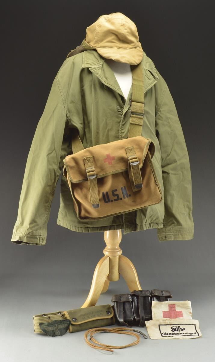 WAR SOUVENIRS. This group includes a WWII lined green cotton foul weather jacket having a zippered & buttoned front. / 1 Khaki & green canvas medics or doctors bag stenciled “U.S.N.” on the front with a red cross on the flap. Case contains original issue battle dressings & an implement kit. / 1 Green cotton web pistol belt with interlocking buckle and a pocket medical kit stenciled on the front “POCKET CASE M.D. – U.S.N.”. / 1 Navy WWII foul weather hat stenciled “U.S.N.” on the rear flap. Hat is khaki cotton material lined in heavy green wool. / 1 German 3-pocket ammo pouch for a Mauser K98 rifle. / 1 Woven lanyard with spring clip at one end. / 1 German army enlisted breast eagle. / 1 German red cross armband with blood stains. / 1 German armband that reads “hilfs= krankentrager” for a stretcher bearer. CONDITION: jacket shows minimal wear as does the doctors bag. Hat shows moderate to heavy wear. All other items generally show light wear.