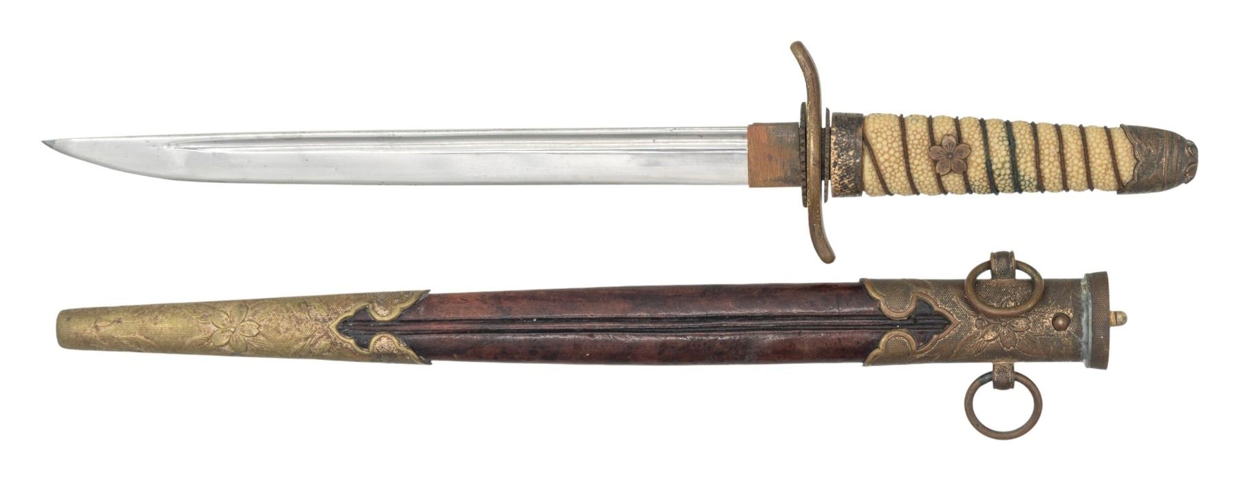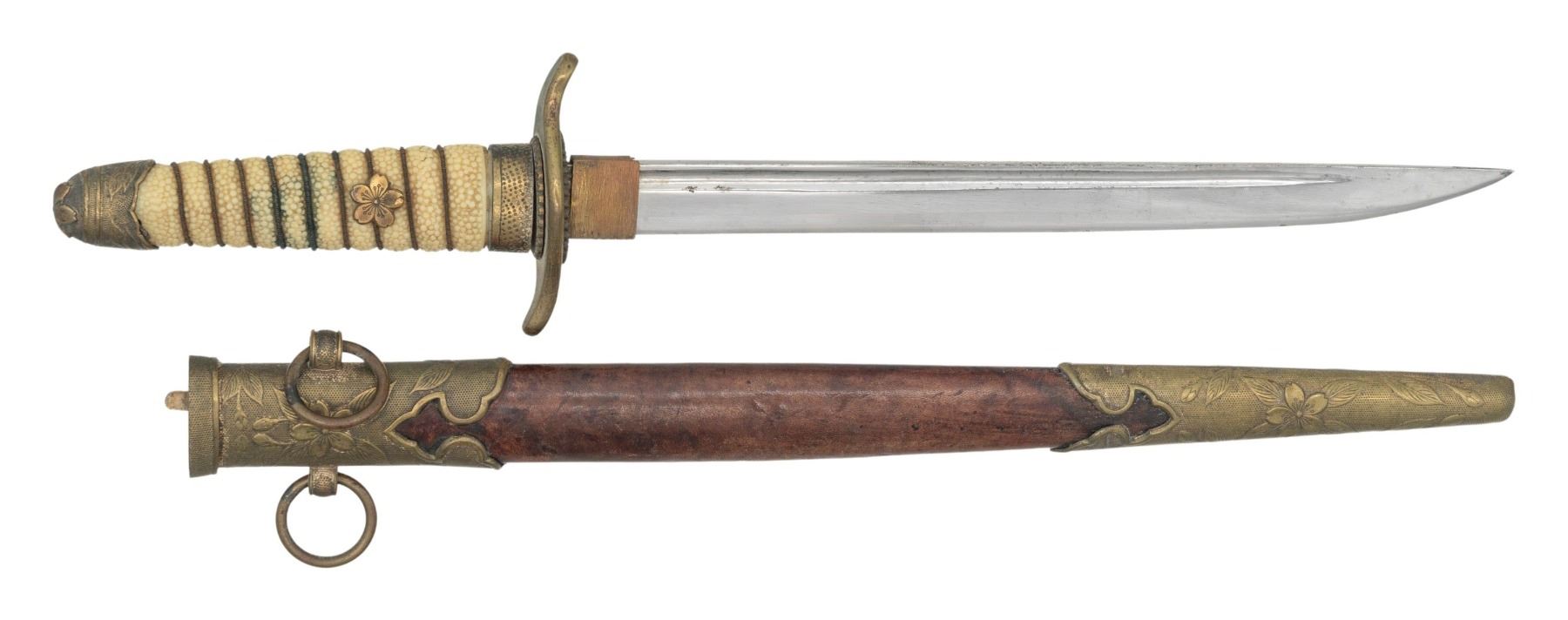 This dagger measures 16 1/4" overall with an 8 3/4" blade that has a 6 1/2" hi leading to a copper habaki. There is an S shaped gilded brass guard with a single seppa above and below. Original fuchi and kashira with a five petal cherry blossom on the top. White simulated shark skin grip with wire wrap and one cherry blossom on each side. The saya has gilded brass fittings that repeat the cherry blossom motif. The body of the saya is brown leather over wood. CONDITION: Blade has a nice polish. Tsuka shows light wear with minor oxidation to the fuchi and wire. The saya shows light wear overall. (02-25816/BF). $400-700.