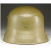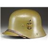 ARTILLERY. This fine helmet has a dark field green painted finish that appears to be of the period. There is a gold-toned Wehrmacht eagle on the left side and a national colors decal on the right. The inside rear of the helmet does not appear to be stamped, and the inside left is stamped "Q.66." Leather 3-pad liner with two tongues per pad. Complete band and chinstrap. CONDITION: helmet finish is better than 95%. Both decals are also better than 95%. Chinstrap and liner show light to moderate wear. (02-23378-1/BF). $600-900.