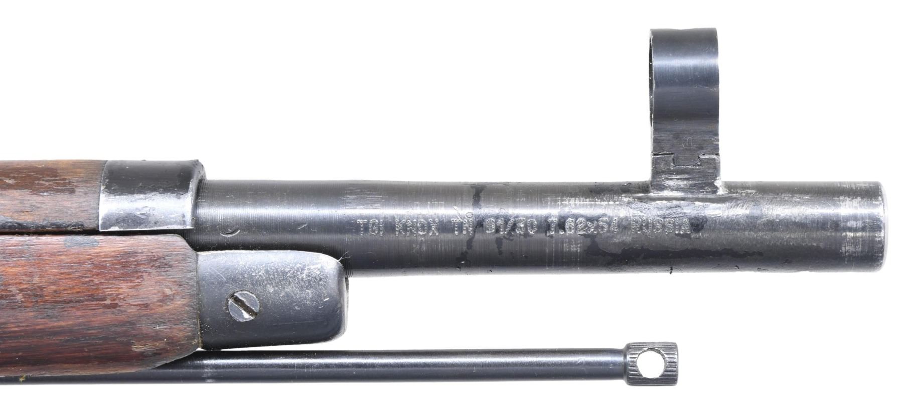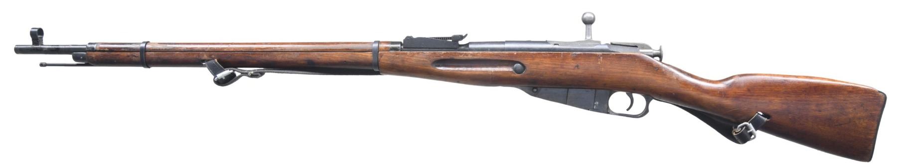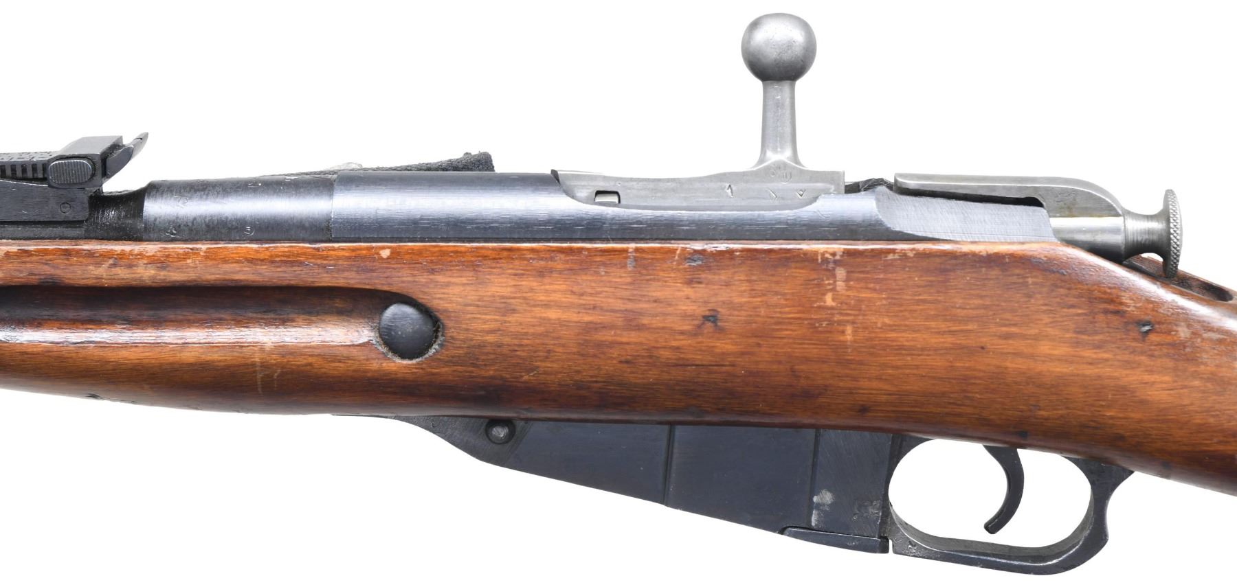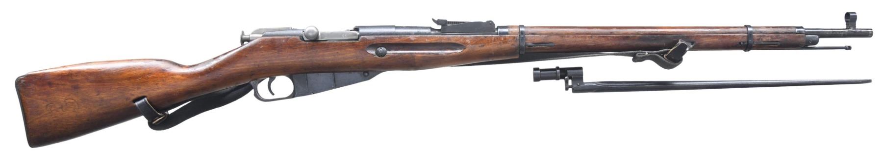ACTION MILITARY RIFLE WITH MATCHING BAYONET. Cal. 7.62x54R. S# WPM0003. Importer serial number. Original Russian serial number matches on bbl., bolt, buttplate, floorplate & bayonet. Bbl. 28 3/4". Import marked on right side of bbl. Tangent rear sight graduated to 2000 meters. Post front sight w/ protective hood. Bbl. marked over chamber w/ Izhevsk hammer & sickle w/ wreath dated "1943". Additionally marked w/ arrow & triangle / boxed proof commission mark on right side. Round receiver, straight bolt handle, Cleaning rod is present. Hardwood stock set. Buttstock roundel has been rendered obscure by arsenal rework finish. Black web sling w/ leather collars. UNATTACHED ACCESSORIES: 16 7/8" quadrangular spike bayonet. Serial number matches the rifle. Bayonet is in very good arsenal rework condition. CONDITION: stock set has worn flaking arsenal rework finish w/ numerous handling marks. Approx. 1/2" by 1" inletted repair behind lower band. Metal retains 80% arsenal rework finish w/ thinning & light wear. Very good shiny bore w/ sharp lands. (24-4848/RW). CURIO. $300-500.