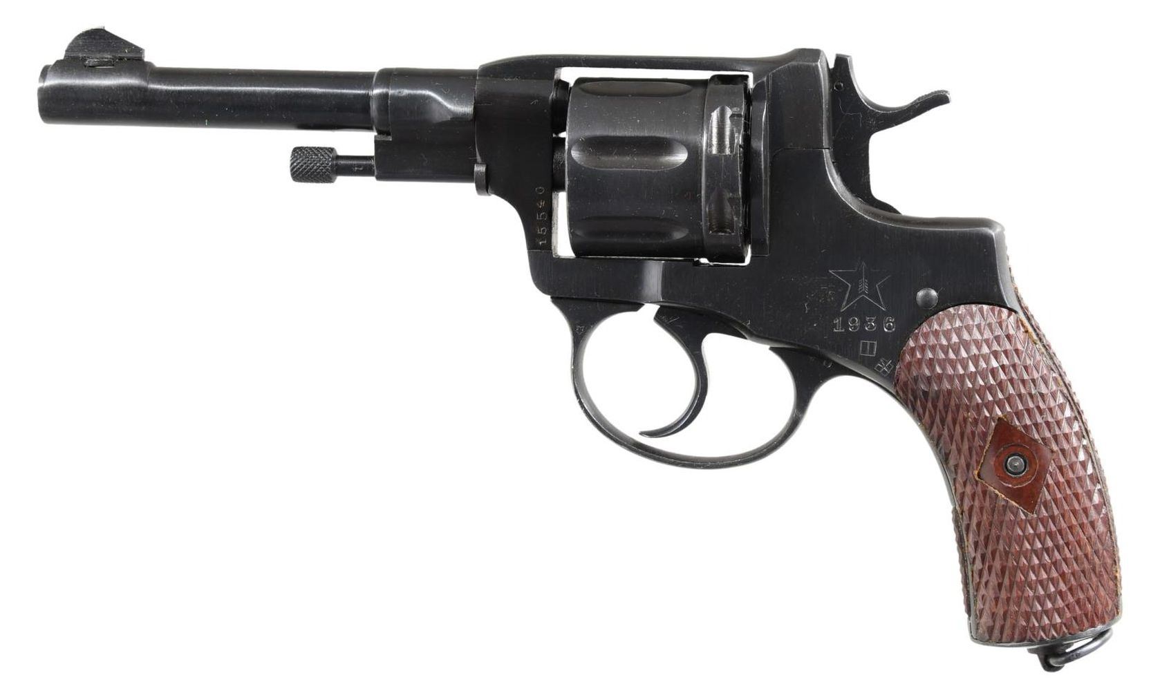 Cal. 7.62 Nagant Revolver. S# N0033. Bbl. 4 1/2". Blade front sight. V-notch rear sight. The right side of the frame has import marking with an importer-added serial number. Matching numbers on frame and cyl. The right sideplate has the Tula Star, 1936 date, and boxed Arsenal refurbishment marking. Arsenal reworked blue finish. Checkered brown bakelite grips. Lanyard ring is present on the bottom of the grip frame. CONDITION: grips show some light handling wear. Metal retains nearly all arsenal rework blue with some light handling wear. Bore has some frosting but strong rifling. PROVENANCE: the Lifelong Collection of Terrance McCarty. (24-235/MJC). CURIO. $200-400.
