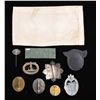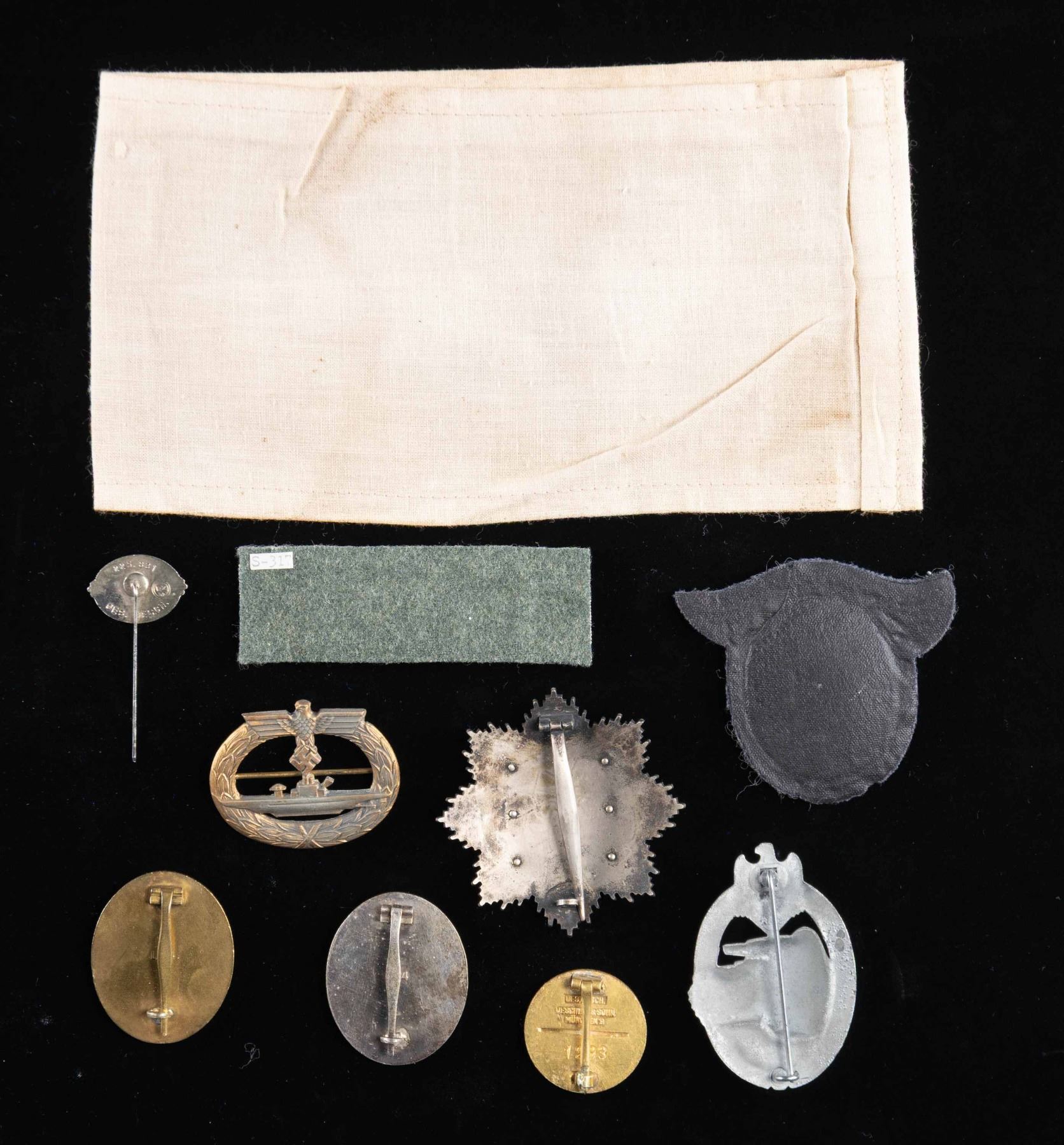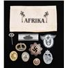 This lot contains WWII style German items that we believe to be reproduction. The group includes 1 armband that reads "AFRIKA", 1 German Cross in silver with 6 rivet construction and a wide pin, 1 Submarine badge, 1 gold Wound Badge, 1 silver Wound Badge, 1 gold Party pin by Deschler, 1 SS stick pin, 1 Tank Assault Badge, 1 Tank Destroyer sleeve Badge, and 1 cloth Luftwaffe Pilots and Observers Badge. CONDITION: all items show light wear and the armband shows staining. (02-25581-5/BF). NON-GUN. $250-500.