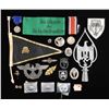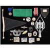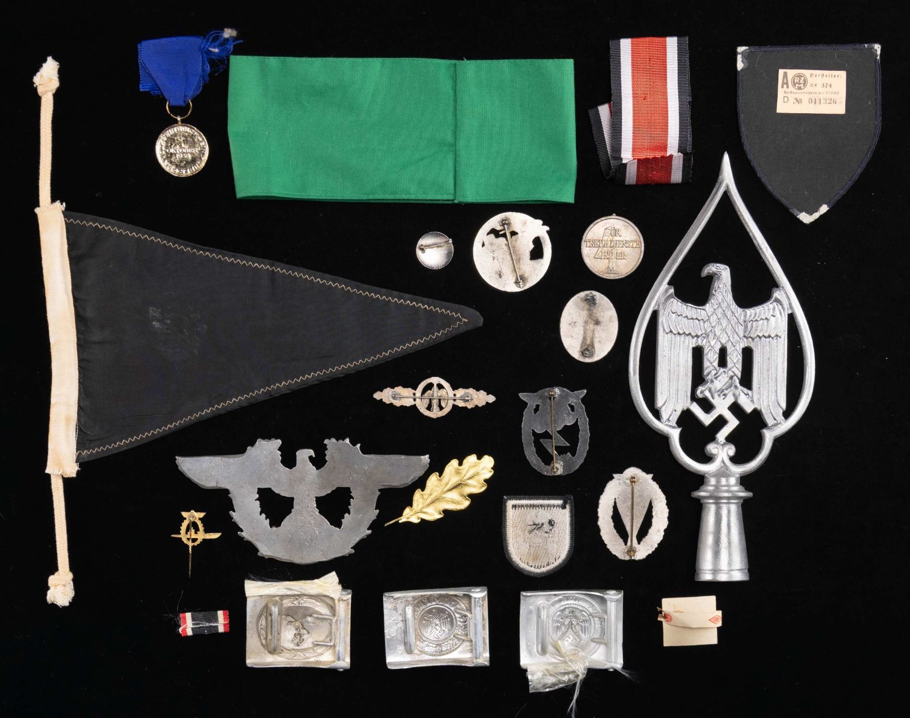 this lot of reproduction WWII German items include, 1 army belt buckle, 1 HJ belt buckle, 1 luftwaffe belt buckle, 1 Party pin, 1 aluminum veteran's flag pole top, 1 Silver Wound badge with no pin, 1 Knight's Cross ribbon only, 1 Police shako eagle, 1 Balloonist badge, 1 Blockade runner badge, 1 SS pennant, 1 security Police armband, 1 Luftwaffe Ground Assault badge, 1 SS 4 year Long Service medal with no ring or ribbon, 1 paper tag, 1 ribbon bar, 2 patches, 1 naval stickpin, 1 Luftwaffe Bomber Squadron clasp, 1 Sudetenland medal with incorrect ribbon, and 1 large oak leaf. CONDITION: all items generally show light wear. (02-25337/BF). NON-GUN. $200-400.