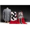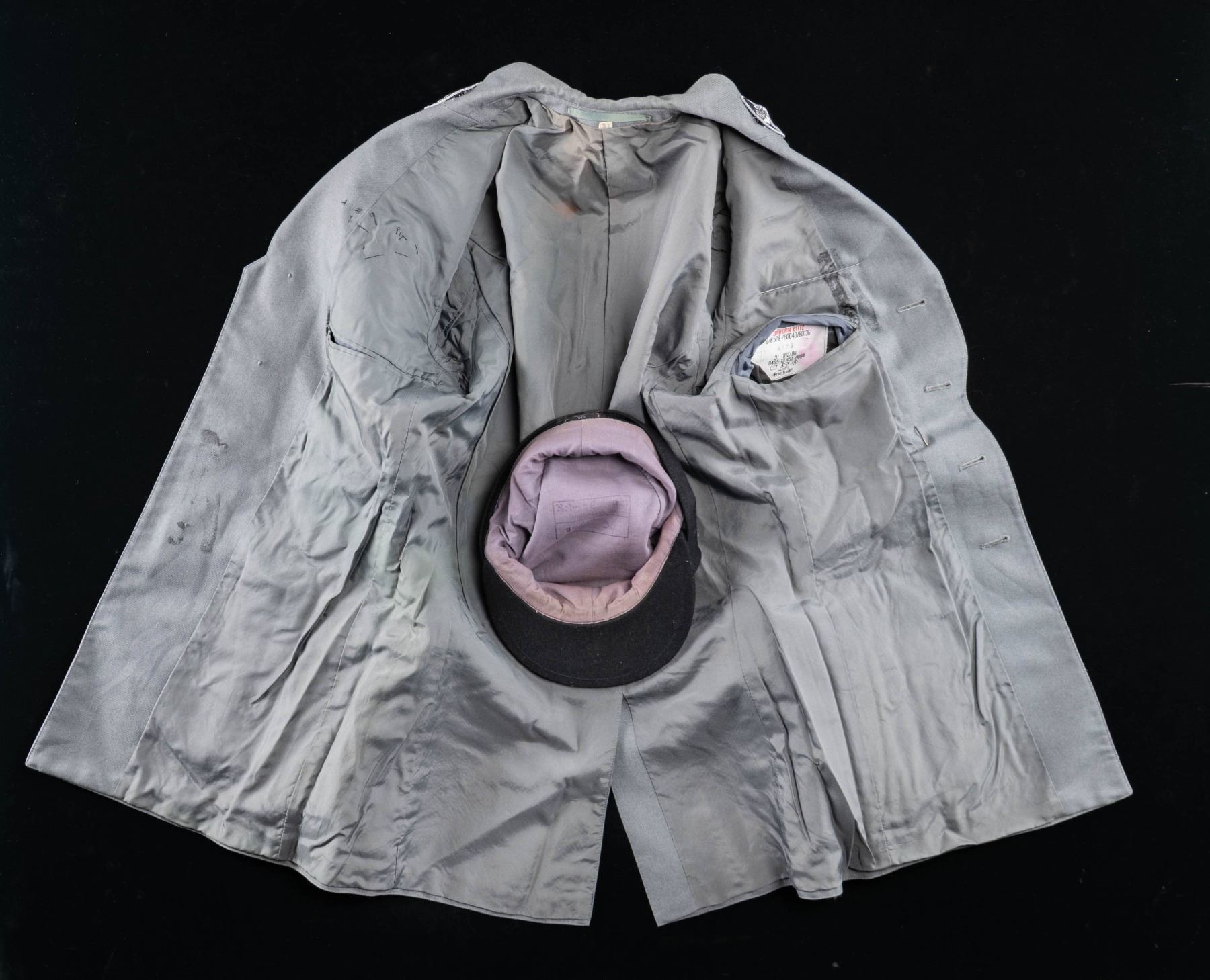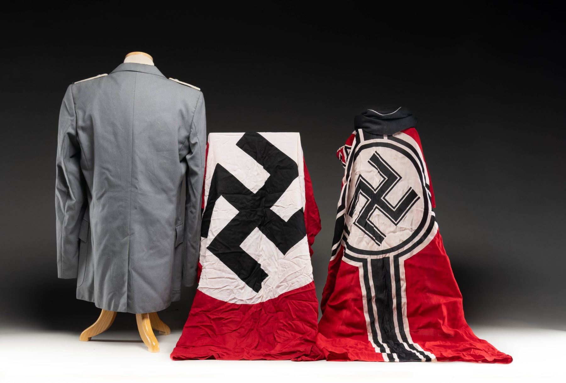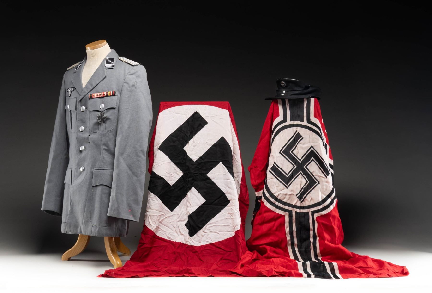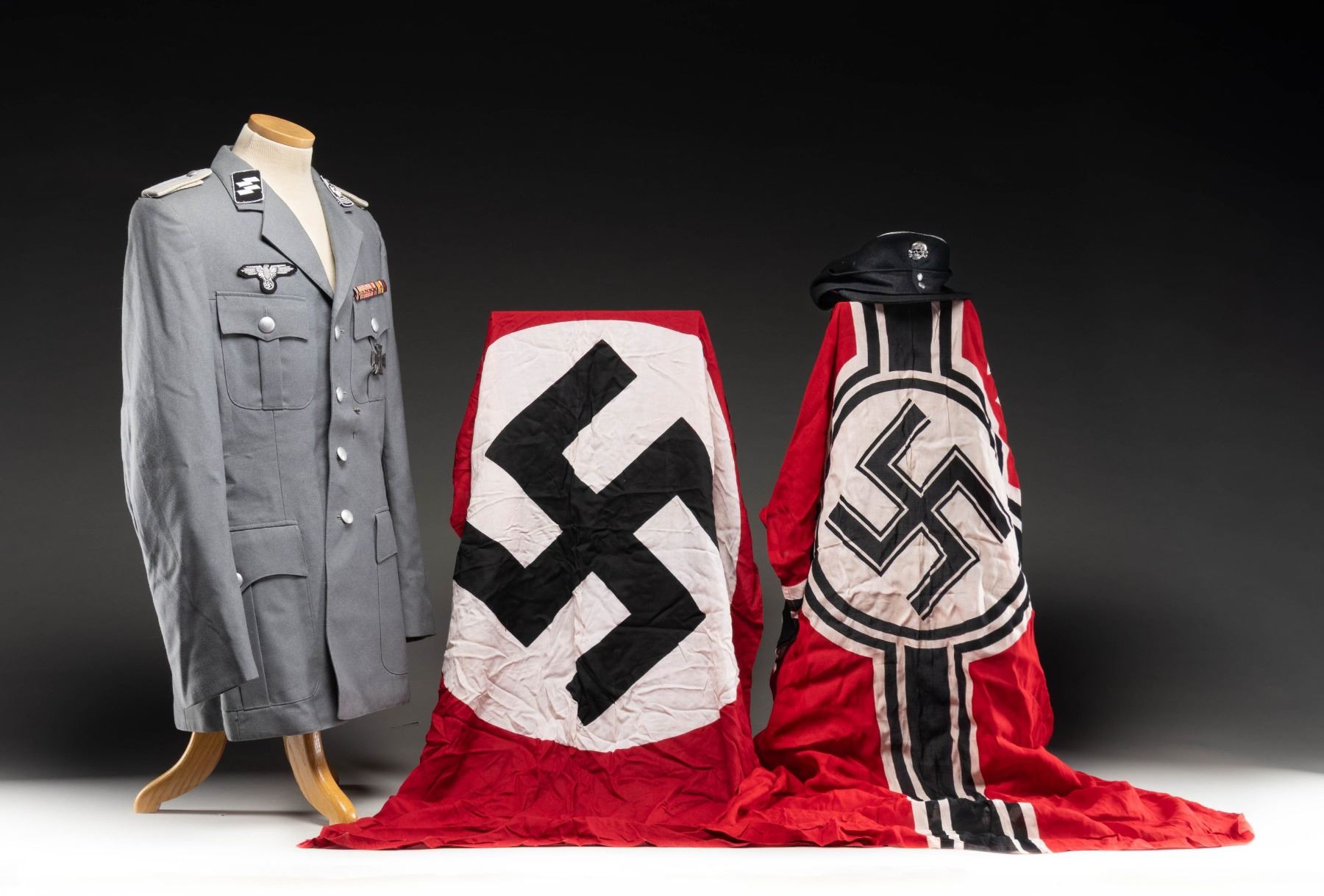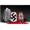 This group of item should be considered post WWII or reproductions. The lot includes 1 M43 style SS officer's cap with a deaths head insignia on the front, 1 Reproduction SS officer's tunic with all reproduction insignia. However, the uniform does have an authentic 8 award ribbon bar for mostly WWI awards, 1 Kriegsmarine battle flag measuring 34" x 57", and 1 Party flag measuring 34" x 56". CONDITION: all items exhibit very light wear. (02-26112/BF). NON-GUN. $200-350.