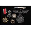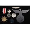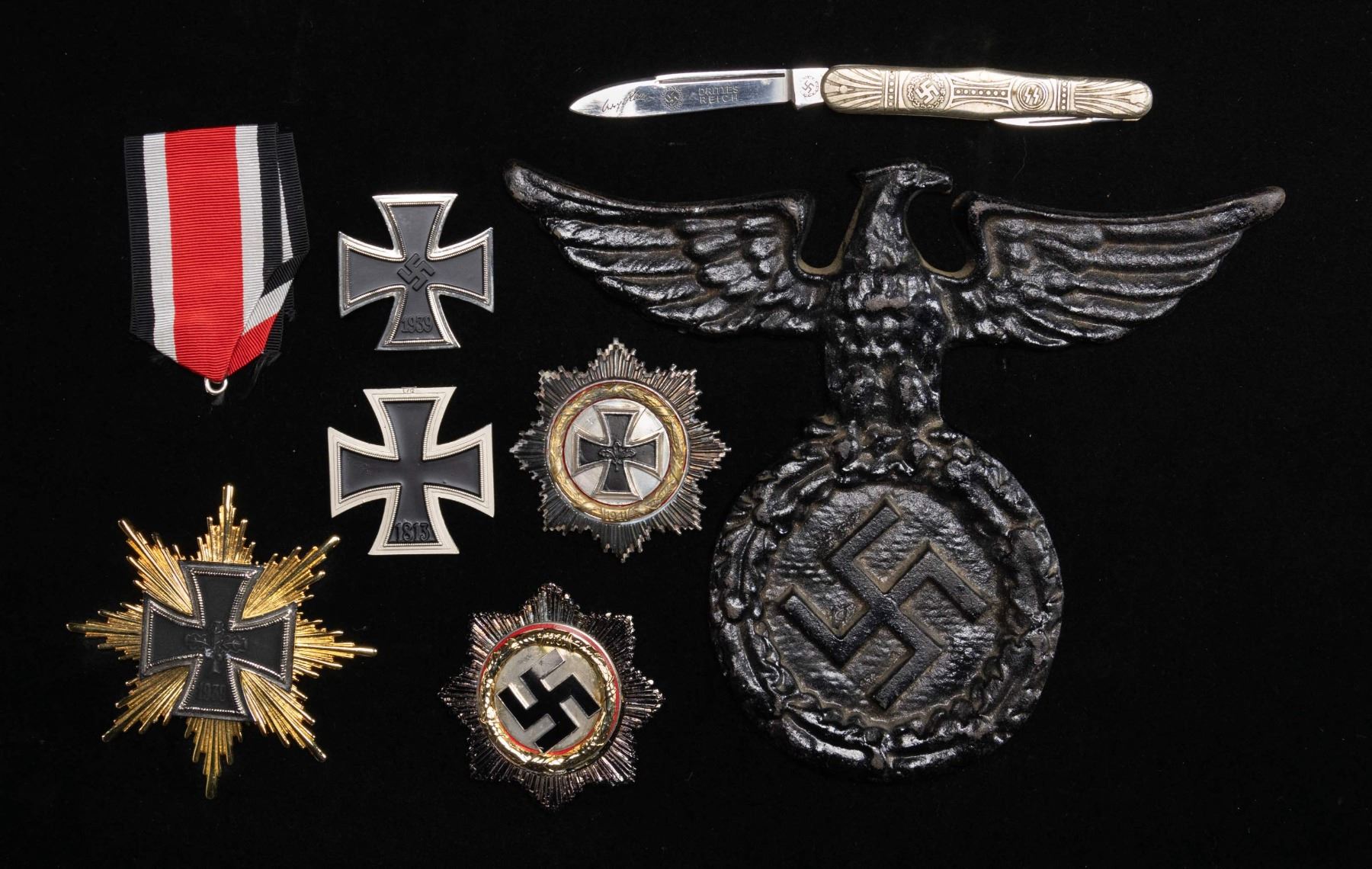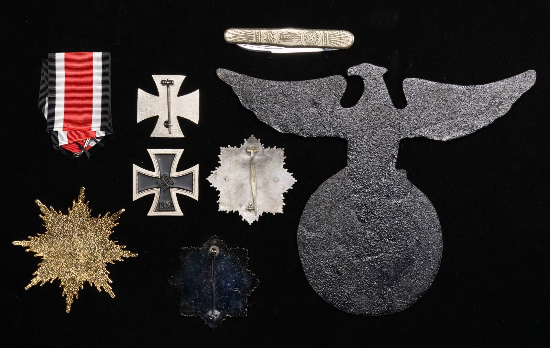 This group contains a nice example of a post war German Cross with an "Iron Cross" in the center. The group further includes the following reproductions, 1 Knight's Cross with ribbon but the ring is detached, 1 German cross with the center separated, 1 SS folding knife, 1 black painted Party eagle wall plaque, 1 WWII Iron Cross 1st class, and 1 Grand Cross of the Iron Cross. CONDITION: all items are like new or show very light wear. (02-25433/BF). NON-GUN. $100-300.