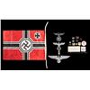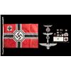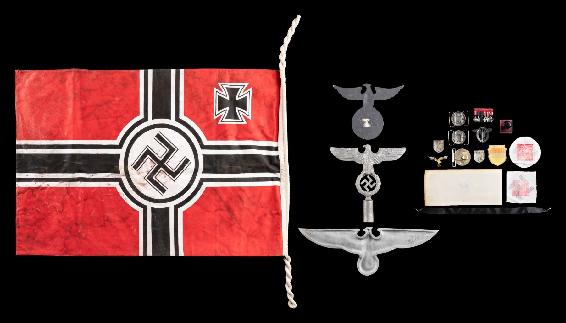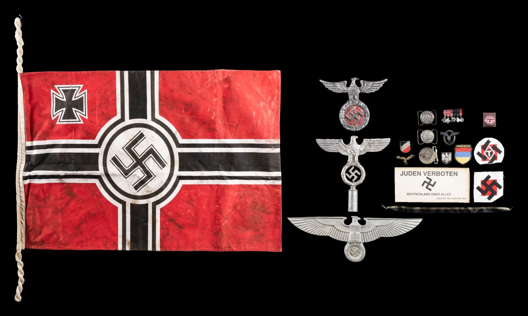 This lot of WWII reproduction German Items includes 1 aluminum building or monument eagle measuring 18" in length, 1 cast aluminum flag pole top, 1 aluminum political eagle for a plaque, 3 belt buckles, 1 Luftwaffe Pilots & Observers badge, 1 set of 6 miniature WWII German medals, 2 pith helmet shields, 1 battle flag, 3 patches, 1 document stamp, 1 Luftwaffe general's eagle, and 1 paper sign. CONDITION: all items show light wear and aluminum pieces show some oxidation. (02-25624/BF). NON-GUN. $200-400.