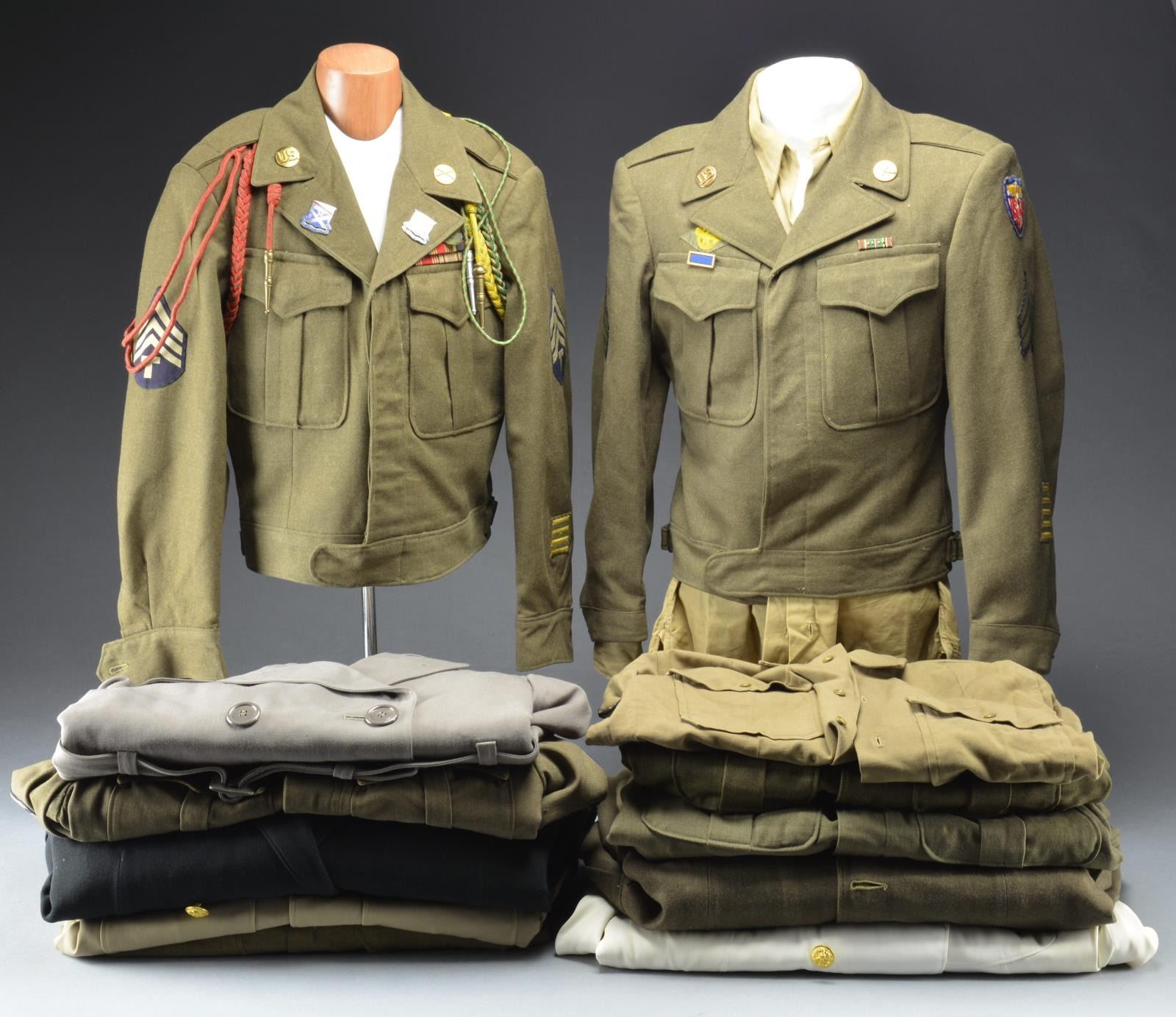 2) WWII UNIFORMS. This group includes an Ike jacket & shirt for an Army Air Corps sergeant w/ appropriate collar disks. Above the left pocket is an ETO ribbon w/ 4 stars & a there is a Presidential Unit Citation bar over the left pocket. There is a US Strategic Air Force patch on the left shoulder. The shirt has sergeant stripes & an Air Corps patch on the left shoulder. / An Ike jacket for an Army Air Corps corporal w/ appropriate collar disks. Above the left pocket are 3 ribbon bars including the Army Good Conduct, ETO & Victory medal. The left shoulder has a bullion on felt Air Force patch & the right shoulder has a South Atlantic Forces patch. / A black dbl. breasted uniform for a Navy Chief Engineman. Rating badge is silver & gold bullion. Uniform is complete w/ pants. / A white dbl. breasted uniform for a Navy Chief Engineman. Rating badge is navy blue on white. Uniform is complete w/ pants & has white gloves in the pocket. / An Ike jacket, shirt & pants for an Army Infantry Technical Sergeant. Uniform has appropriate collar disks & enamel unit crests that read, “In Omnia Paratus”. Uniform has 3 aiguillettes, the first one is red w/ green flecks, the second is yellow w/ green flecks & the third is green w/ pink flecks. Above the left pocket is a 5 award ribbon bar. / A Khaki uniform coat for a Navy Senior Chief Engineman. Rating badge is silver bullion & navy on khaki. A single silver star is applied above the rating badge. / A uniform coat & pants for a sergeant in the 7th Air Force. There is a Ruptured Duck above the right pocket. CONDITION: all uniforms show light wear. (02-15726/BF). $600-900.